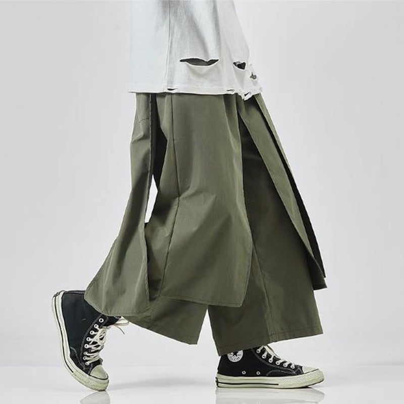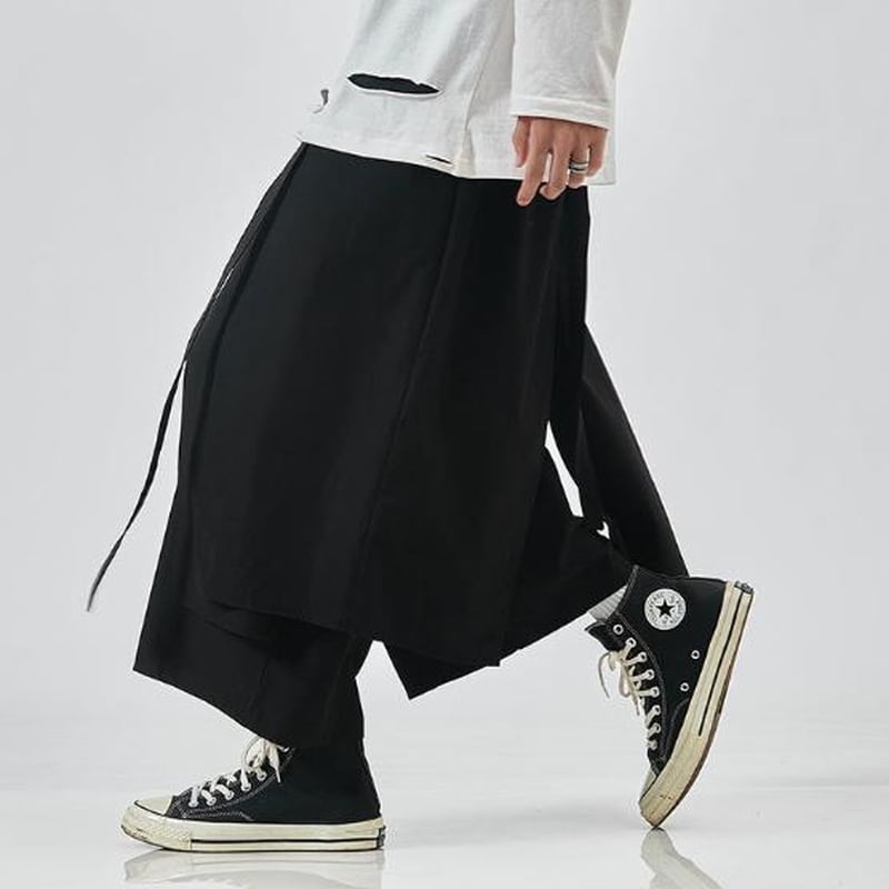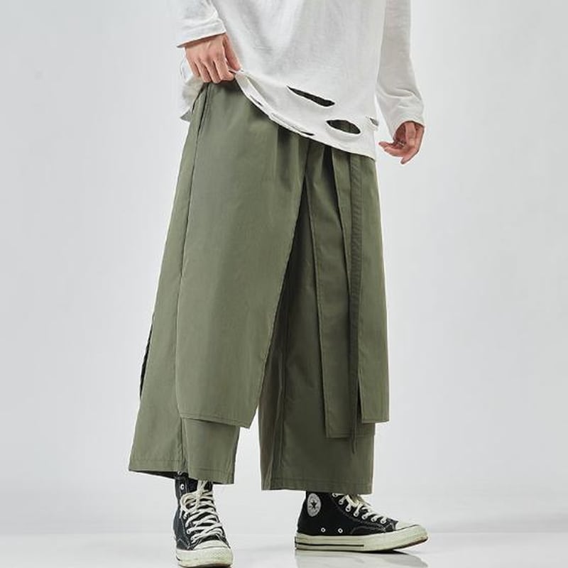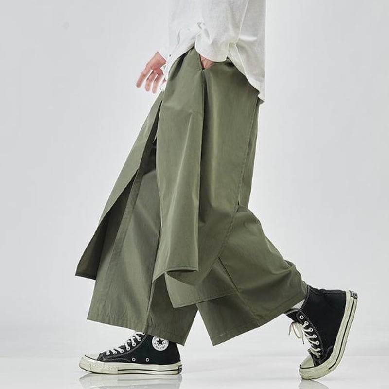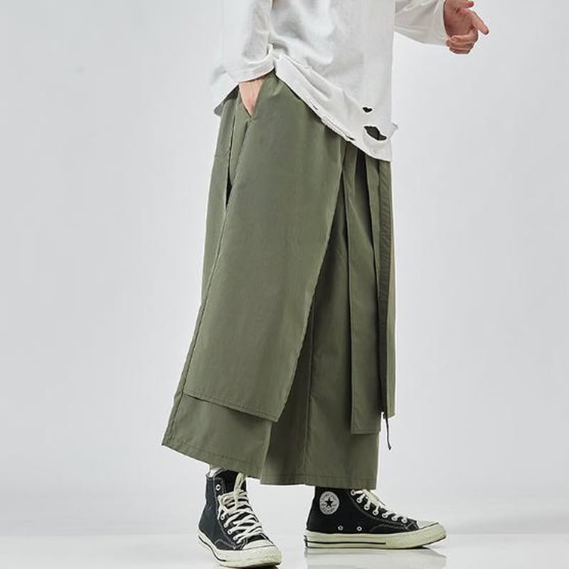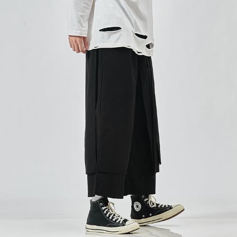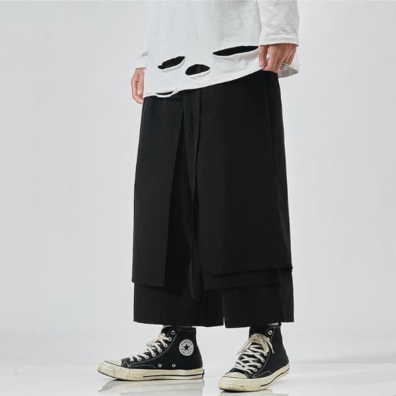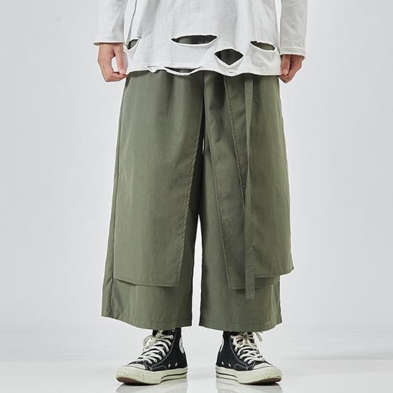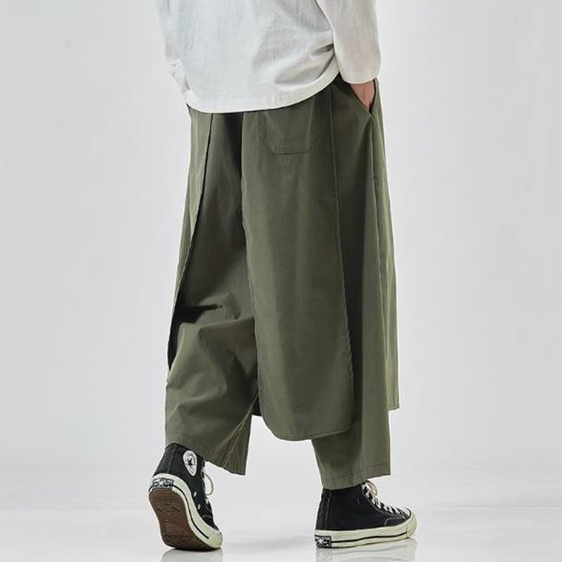 圧倒的なワイドシルエットと、和装の袴を彷彿とさせるボリューム感が特徴のメンズパンツです。