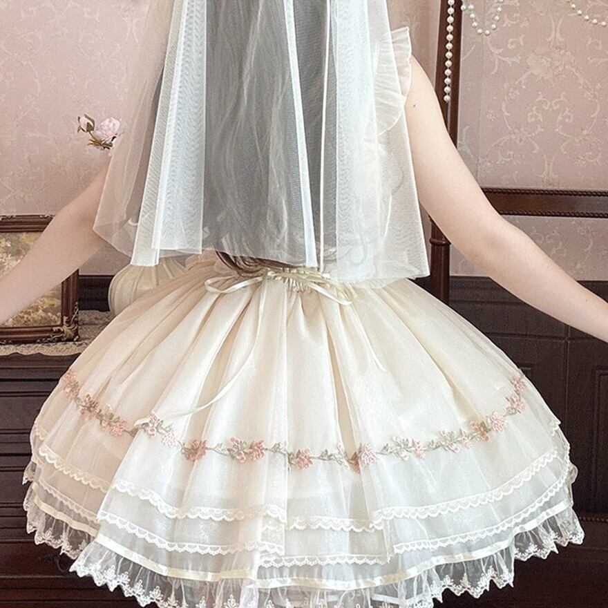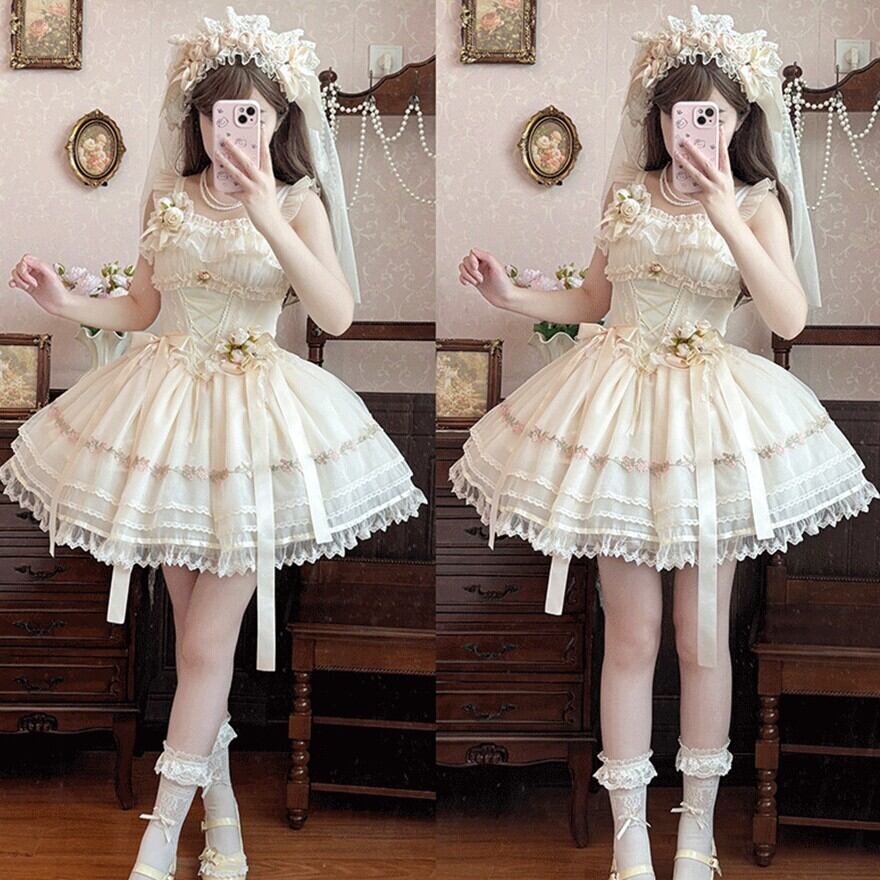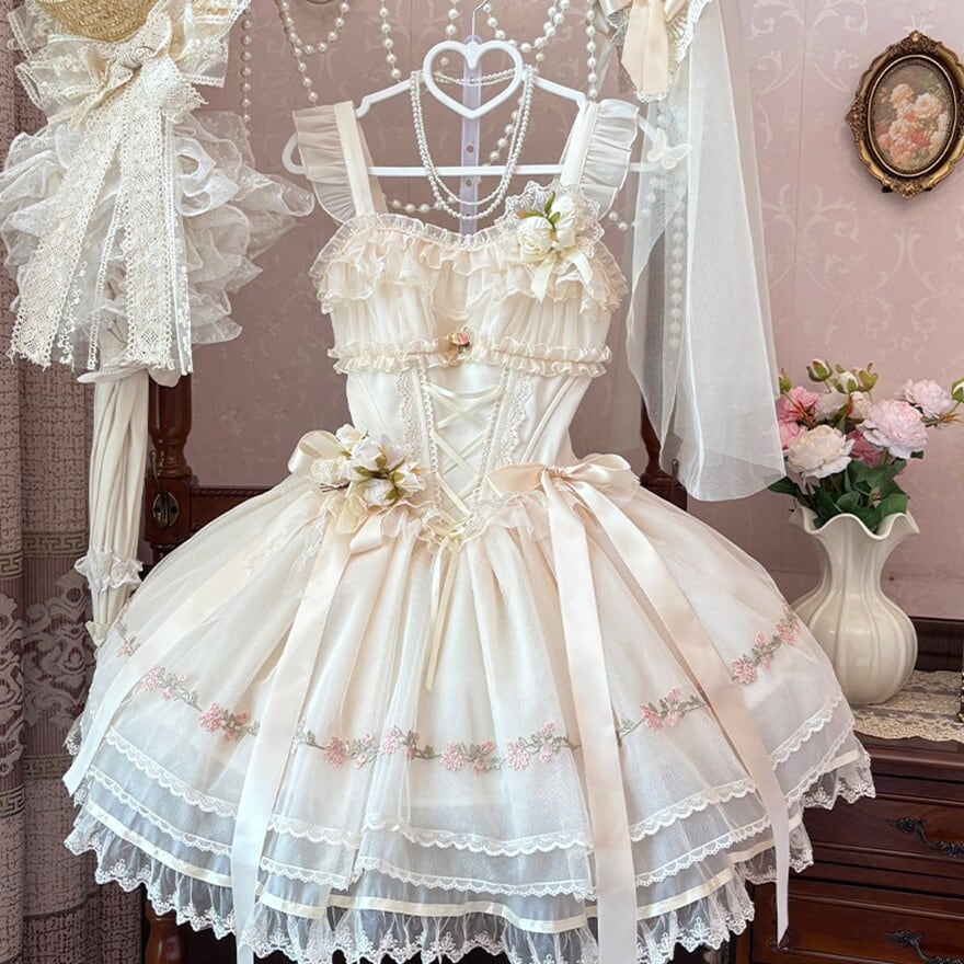 ウエスト部分の編み上げリボンとコルセット風のデザインが、ウエストラインを美しく見せ、ふんわりと広がるティアードスカートがドーリーで愛らしいシルエットを演出します。