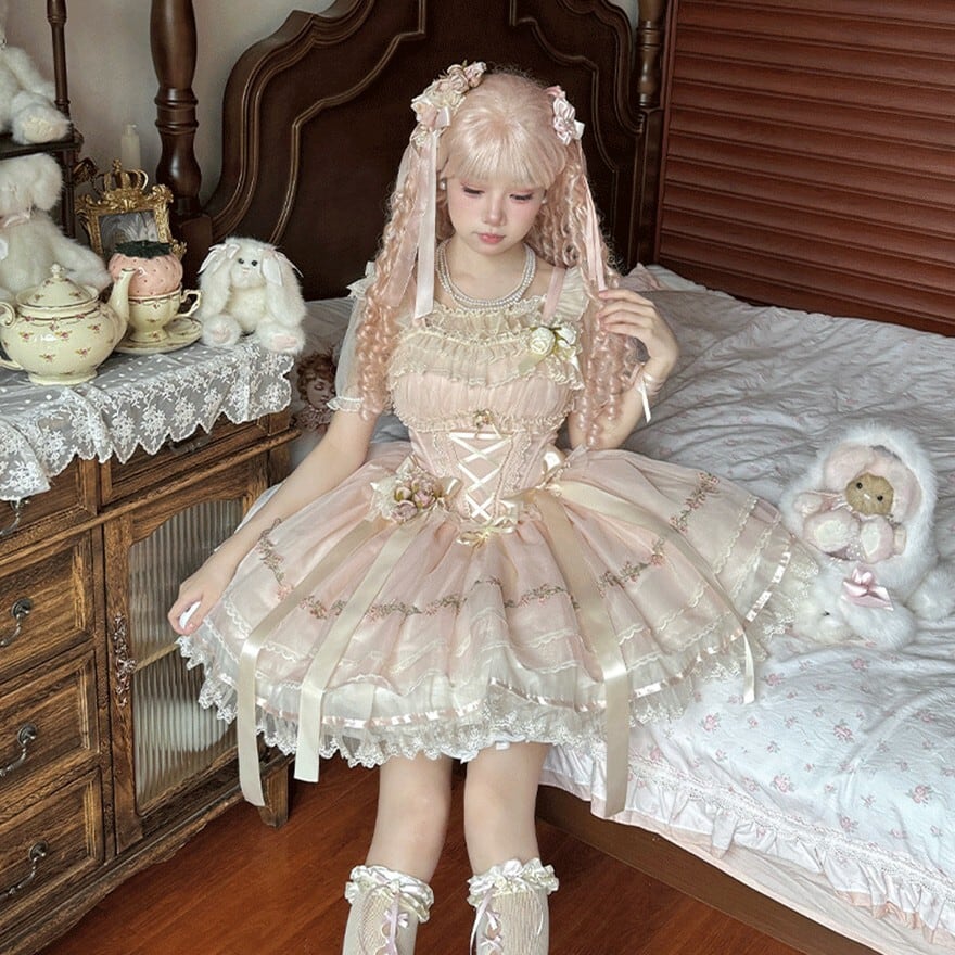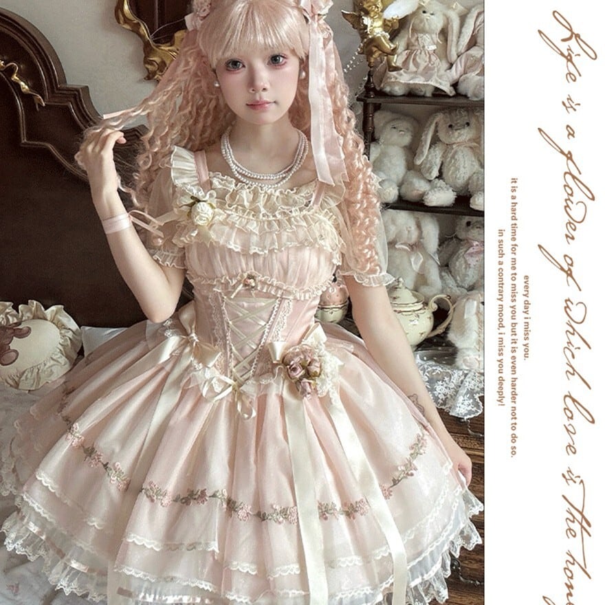 淡いピンク、グリーン、オフホワイトの生地に、同系色の繊細なレースやフリル、そして小さなバラの刺繍が全体にあしらわれた、可憐なロリータワンピースです。