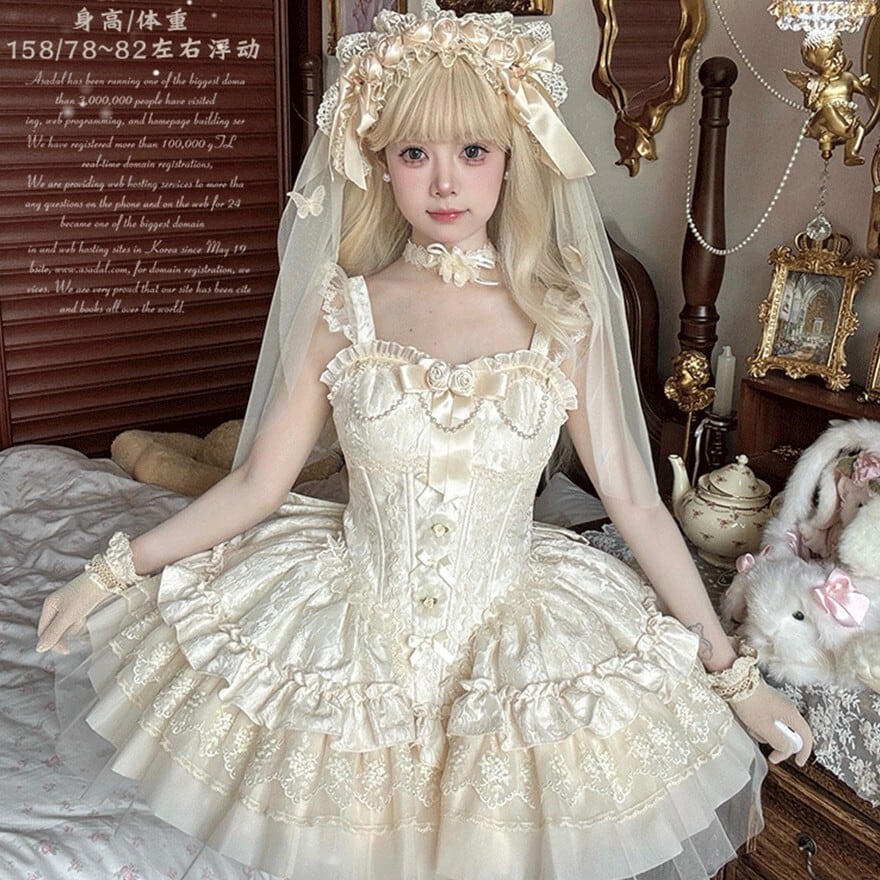 コルセット風の身頃は、バストからウエストにかけてのラインを美しく演出し、幾重にも重なるフリルスカートが、可憐なボリューム感を醸し出します。