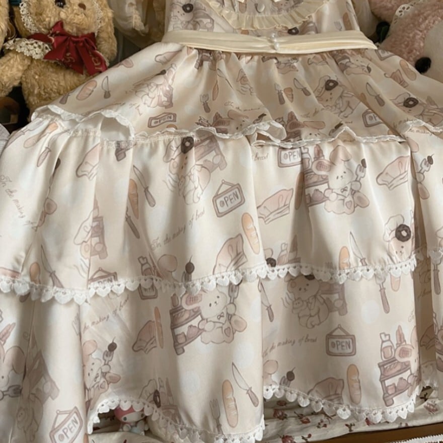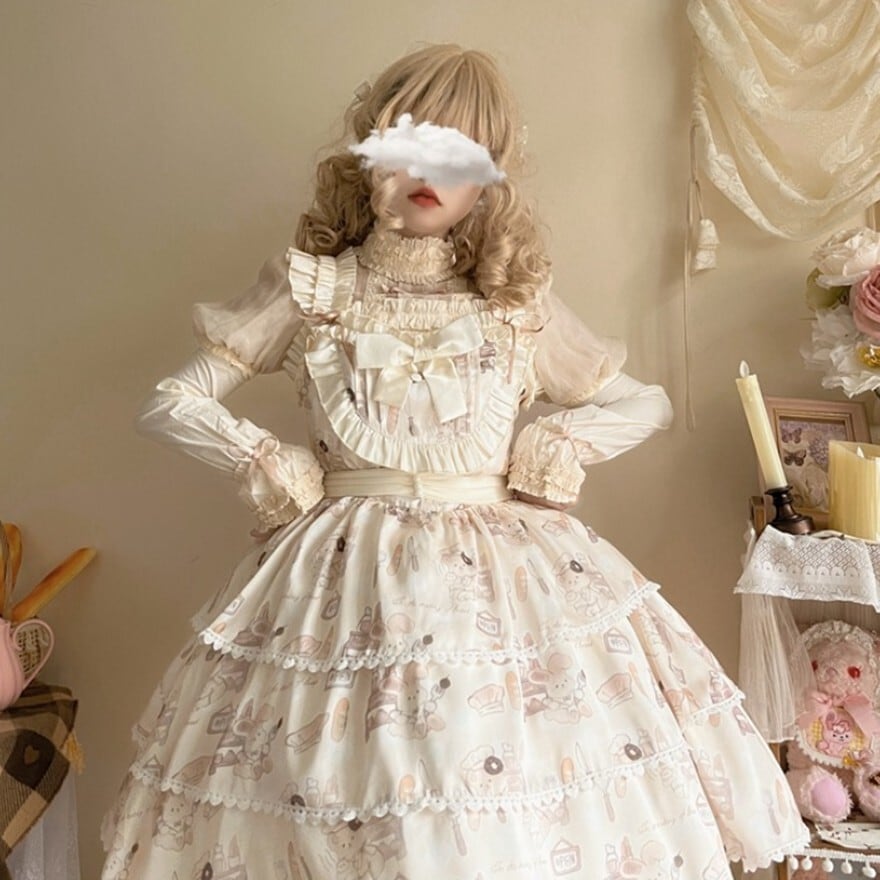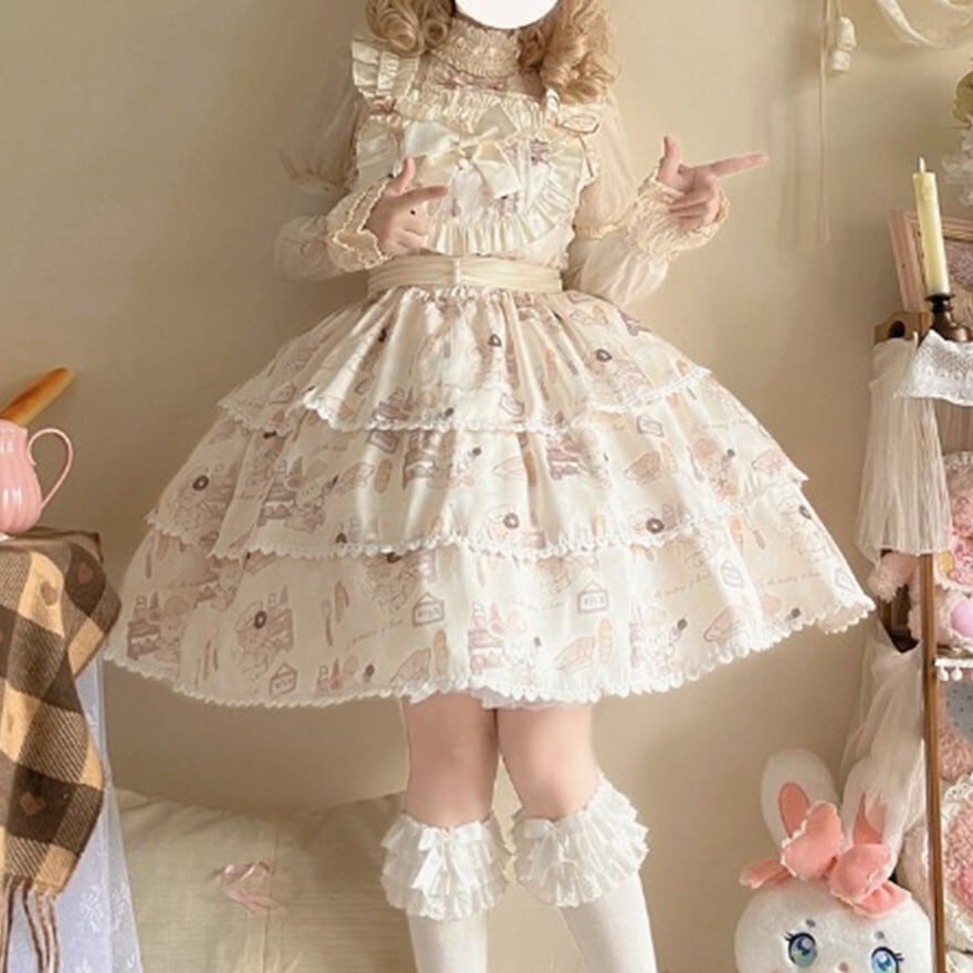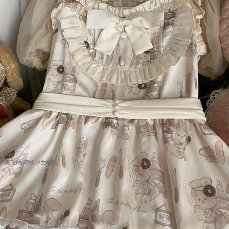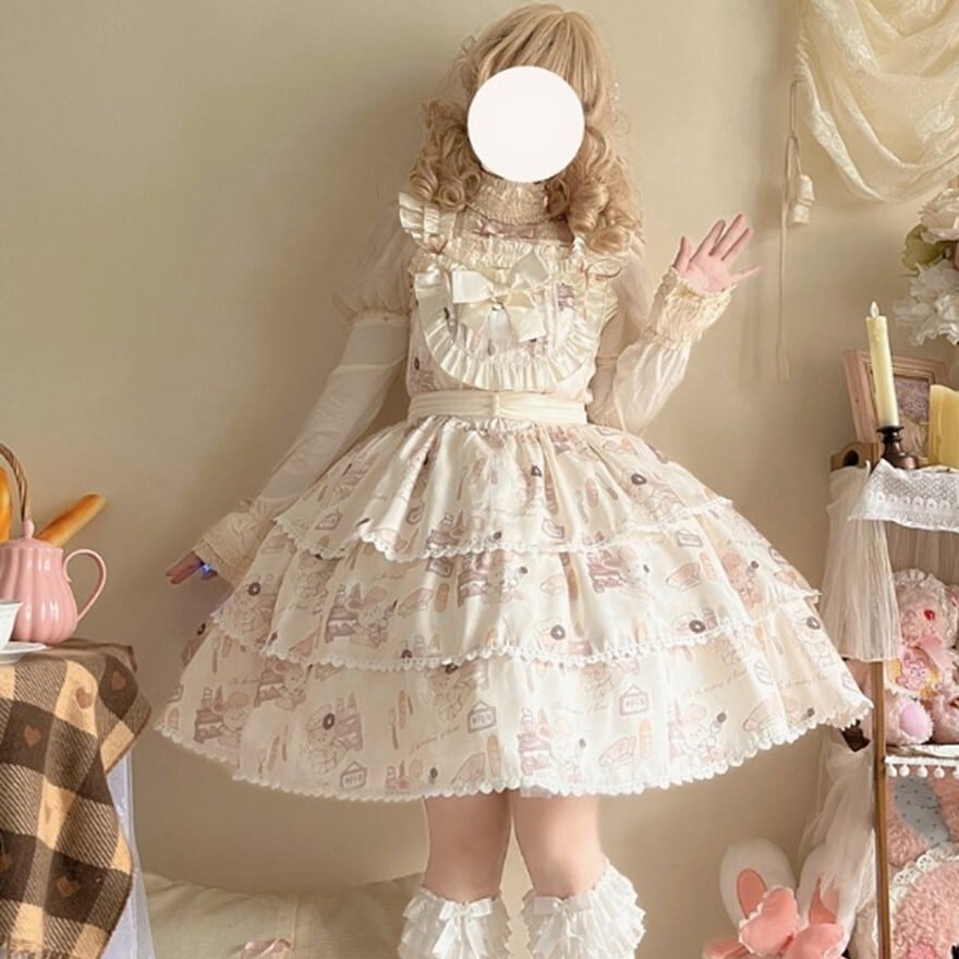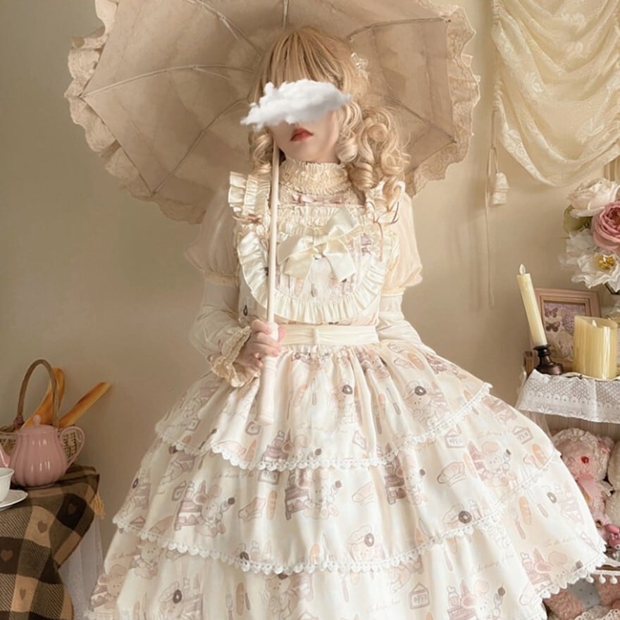 ふんわりと優しい色合いのスウィートロリィタJSKです。生地には、可愛い小鳥たちがパンやお菓子を作っているような、見ていて心が和むオリジナルプリントが施されています。胸元の大きなリボンとフリル付きのサスペンダーが愛らしいアクセント。