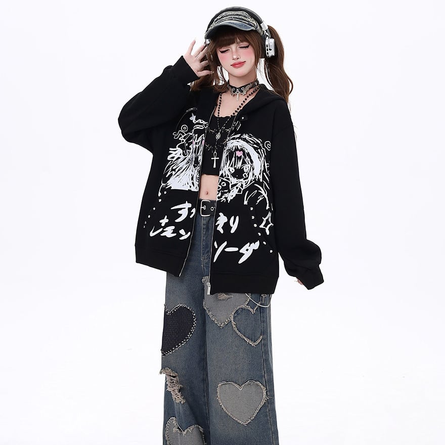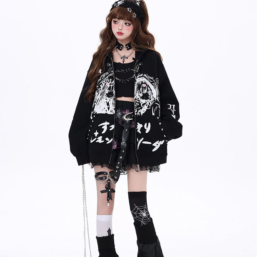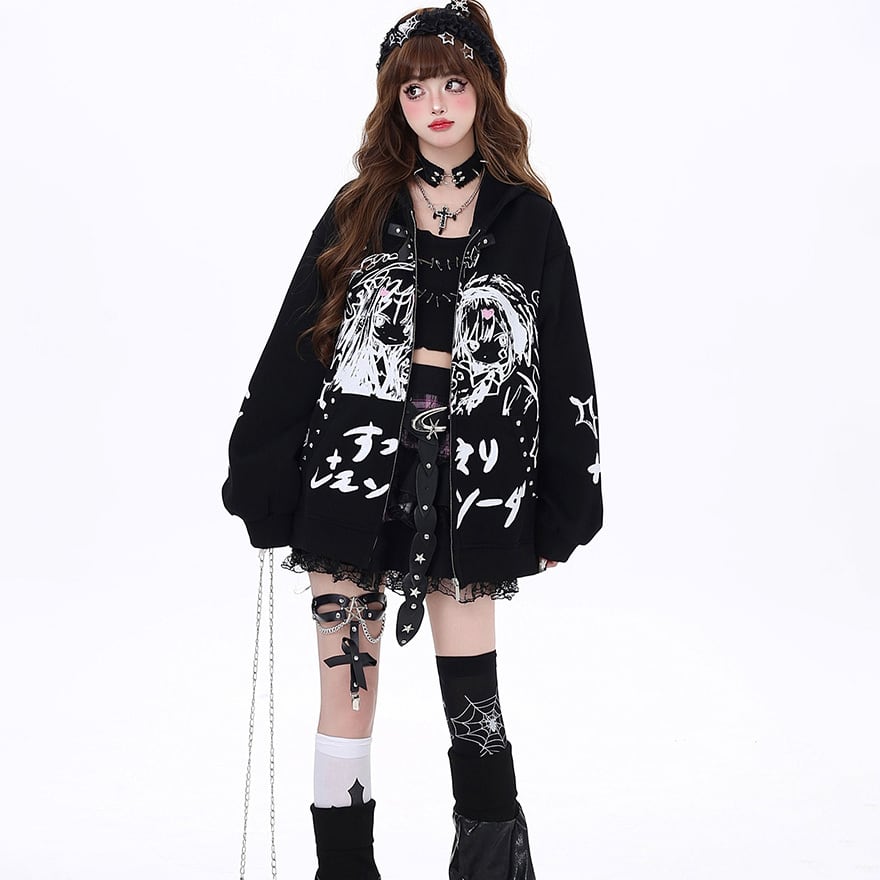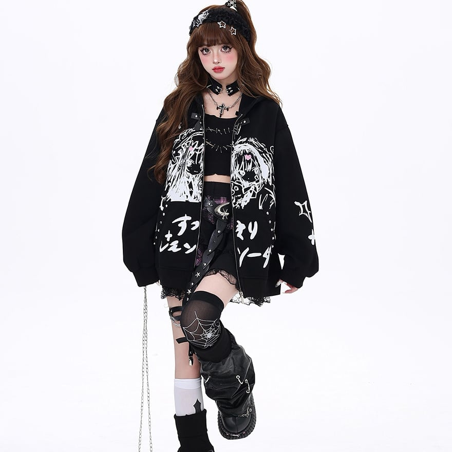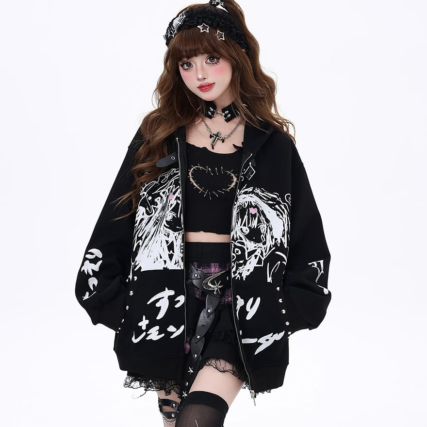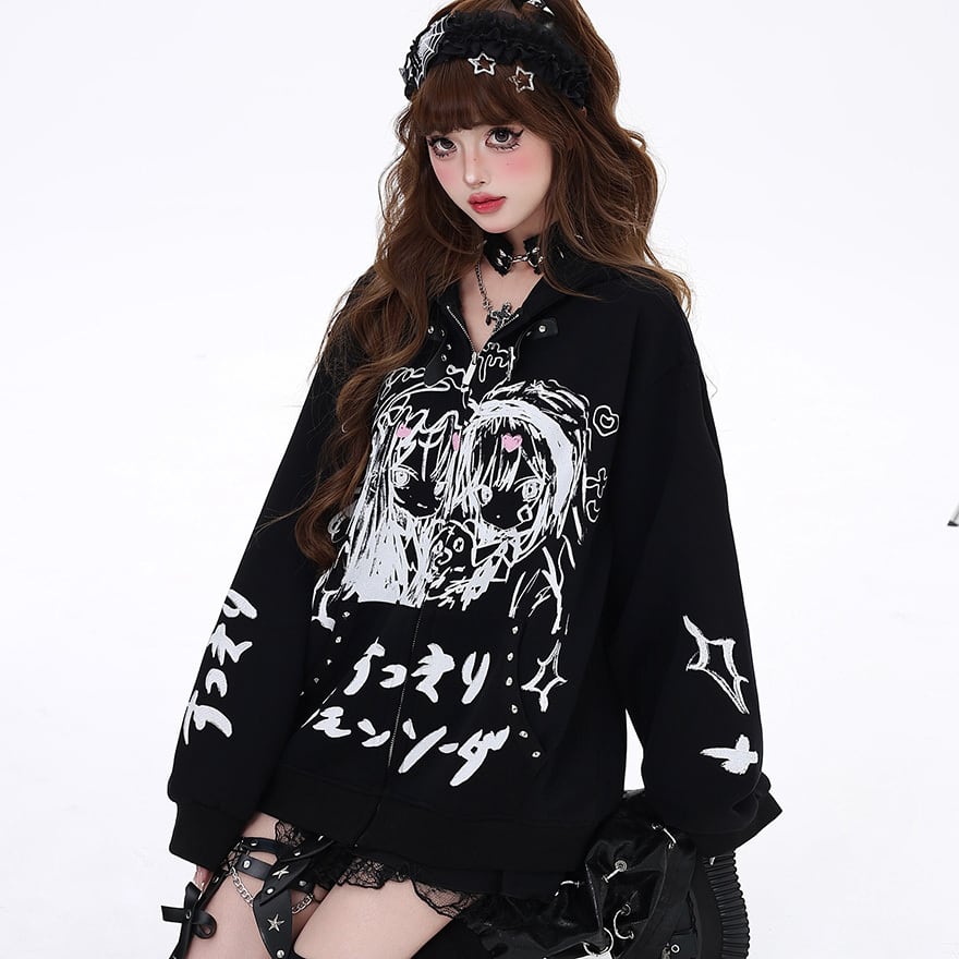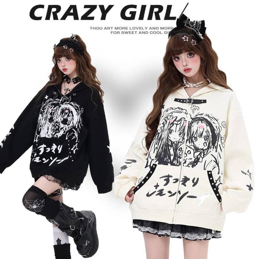 【即納 ブラックM】地雷系 甘辛MIXパーカー 二次元イラスト フーディ CRAZYGIRL