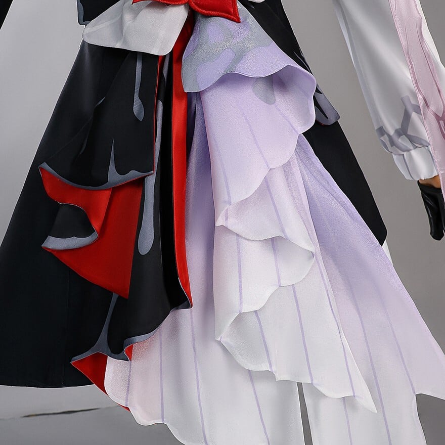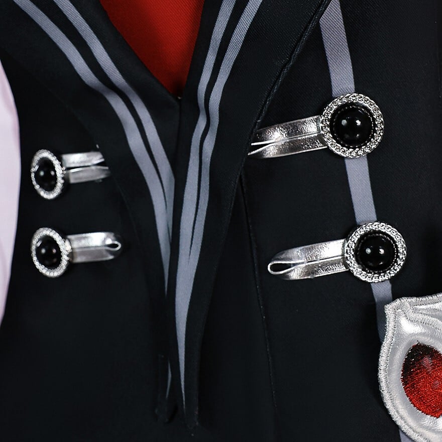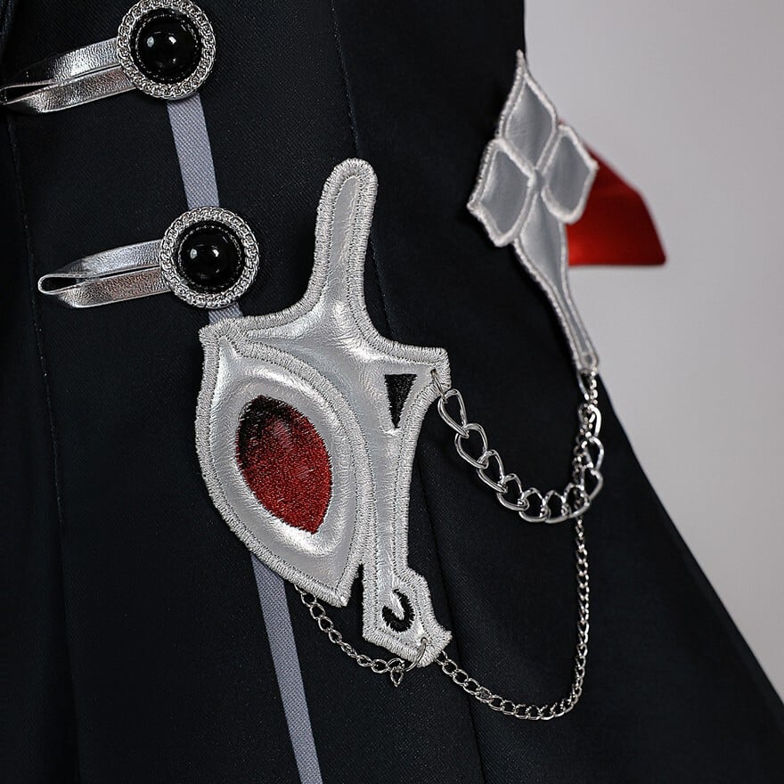 黒を基調としたジャケットスタイルの衣装で、アシンメトリーなデザインが特徴です。右肩には赤い花のような装飾、胸元には真紅の血痕を思わせるようなデザインが施され、ダークな雰囲気を演出しています。全体に繊細な白い模様があしらわれており、ゴシックでありながらも優雅な印象を与えます。袖は左右でデザインが異なり、右は黒地に白い模様、左はフリルのついた白いパフスリーブとなっており、独創的で個性的なデザインです。