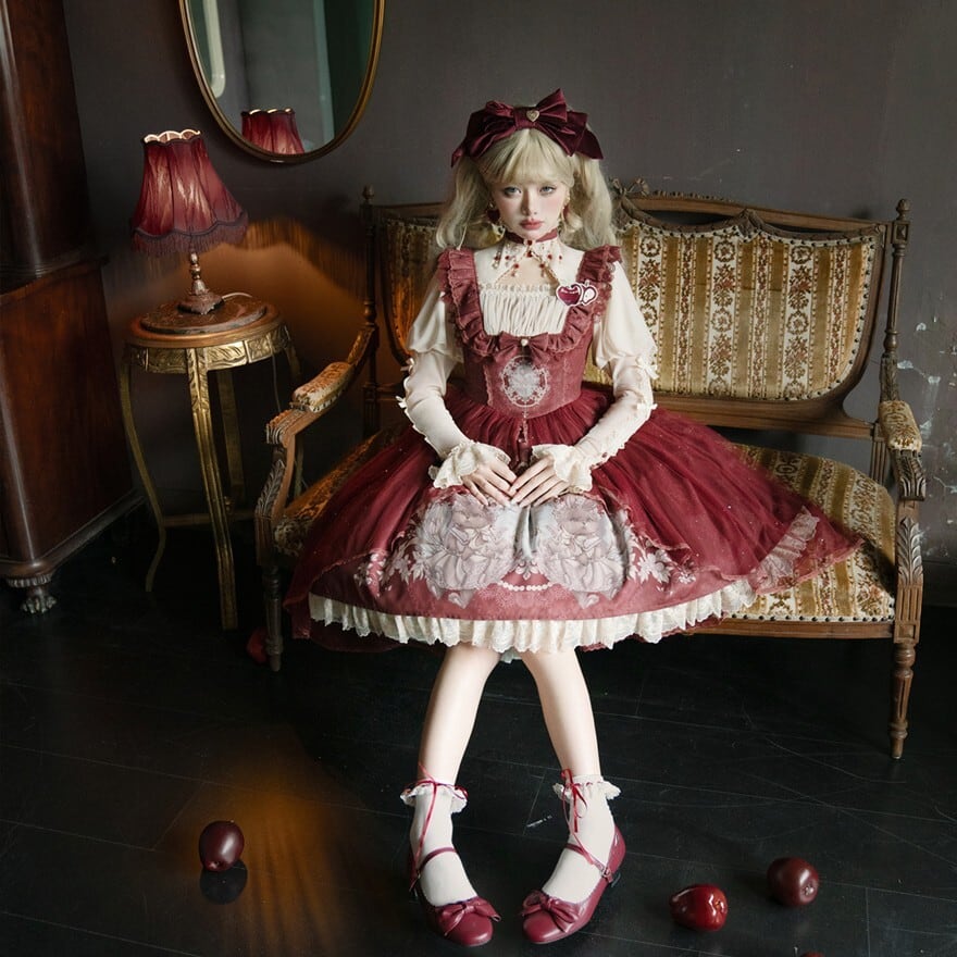 深いボルドーカラーのジャンパースカートに、アイボリーの長袖ブラウスを合わせたセットアップです。スカートには、テディベアやウサギ、お菓子をモチーフにしたロマンチックなプリントが施され、ゴールドのラメやフリル、レースが華やかさを添えています。ウエストの切り替えと広がるスカートのシルエットが、スタイルを美しく見せてくれます。ブラウスは、デコルテと袖にカットアウトのデザインがあり、リボンやレースが可愛らしいアクセントになっています。