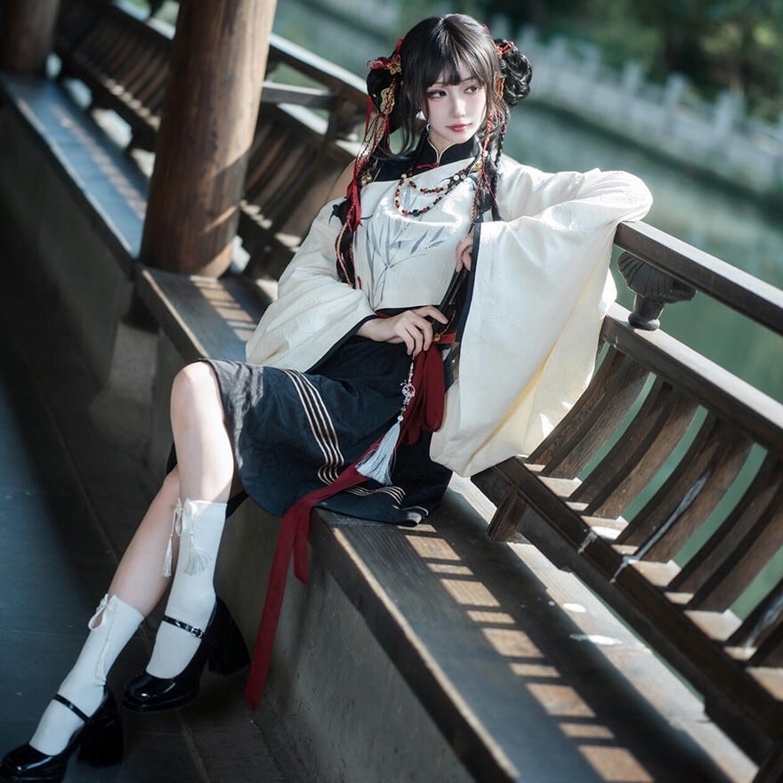 アイボリーの生地に描かれた墨絵のような竹や、袖に施された吉祥文様の柄が印象的な和風ロリータのセットアップです。