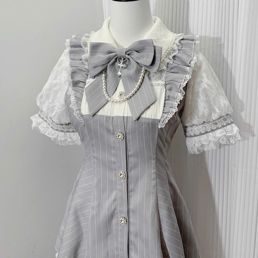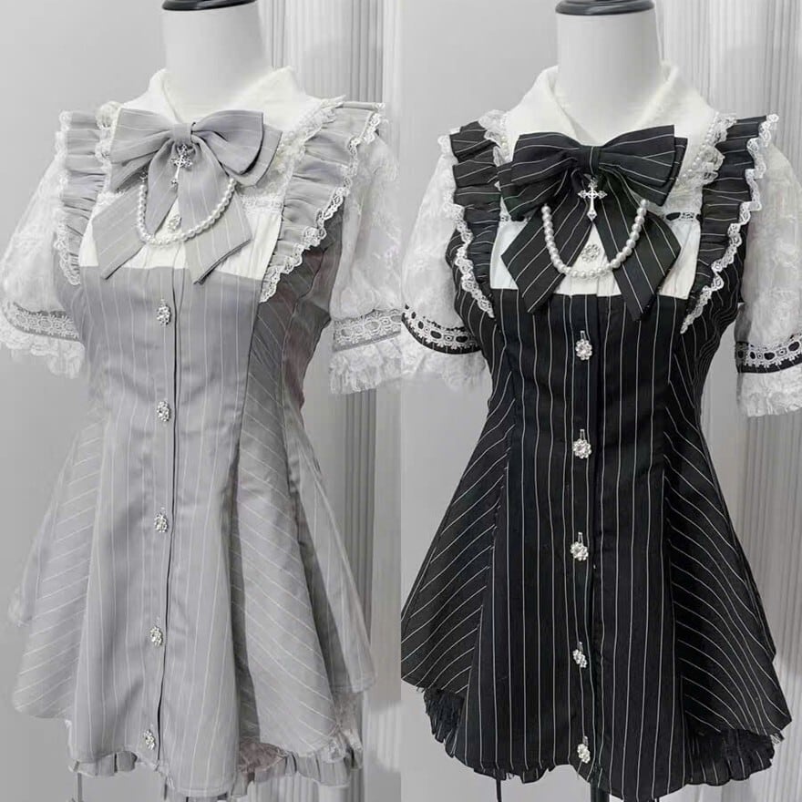 付属のビッグリボンやフェイクパール調のボタン、十字架モチーフのチャームが、可愛らしさの中に清楚なロリータ要素をプラスしています。カラーは、定番のブラックストライプと、柔らかな印象のグレーストライプの2色展開です。