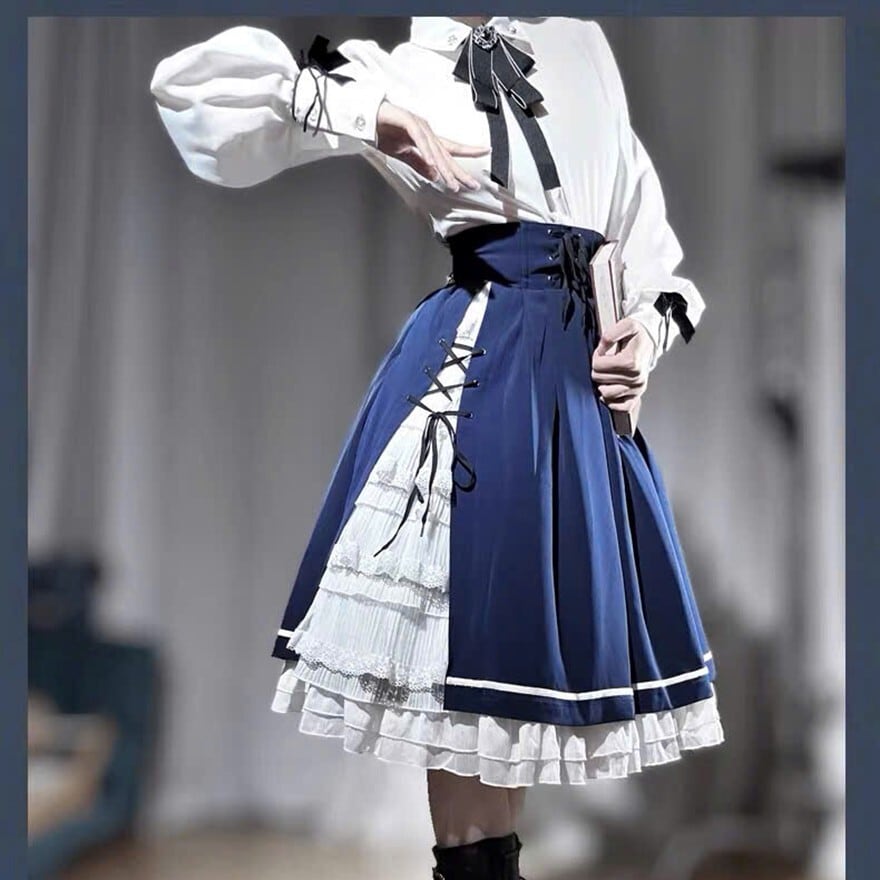 スカート: ボリュームのあるフレアスカートで、前開きデザインの下には白のレースフリルが段々に見える構造です。ウエストの幅広のコルセット風編み上げと、サイドの編み上げデザインが、ロリータらしい可愛らしさとミステリアスな雰囲気を加えています。