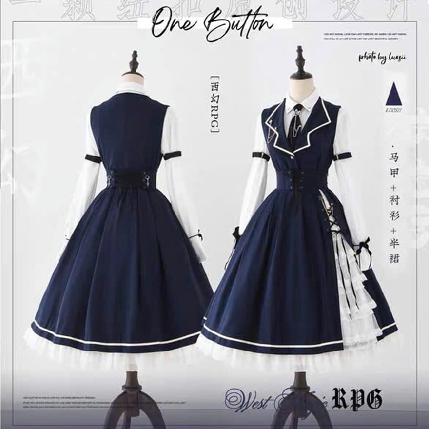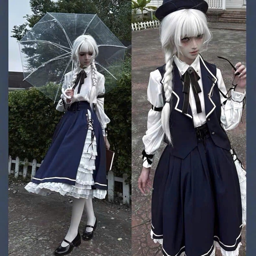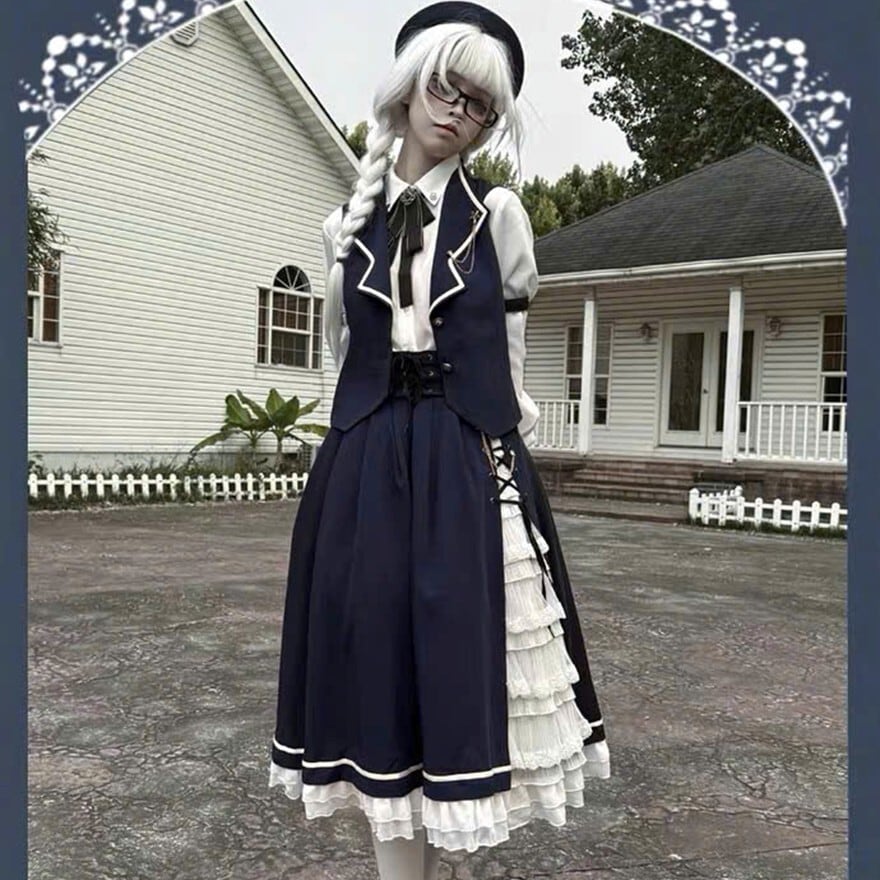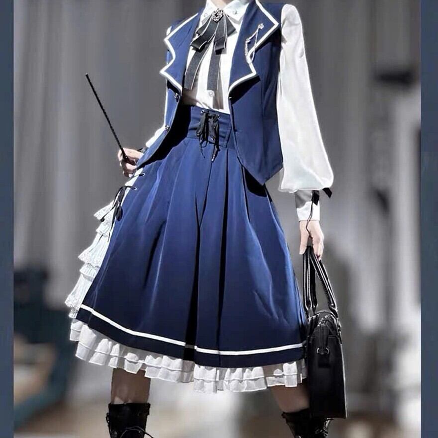 ネイビー(濃紺)を基調とし、ホワイトのパイピングとレースフリルがアクセントになった、ケープ、ベスト、ブラウス、スカートの四点からなるセットアップです。