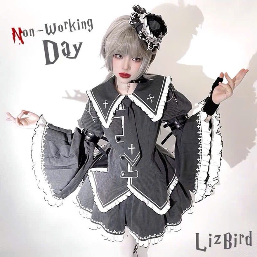 サブカル系ゴシック 3点セットアップ ネクタイ付き 地雷系 ストライプ柄 姫袖 天使と悪魔