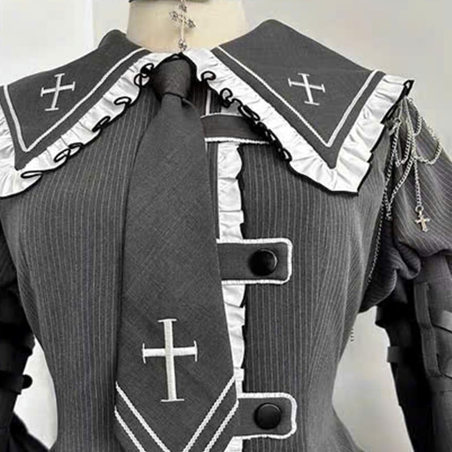 襟元や裾、袖口には白の刺繍で**十字架(クロス)**のモチーフが散りばめられており、デザインに統一感とミステリアスな魅力を加えています。