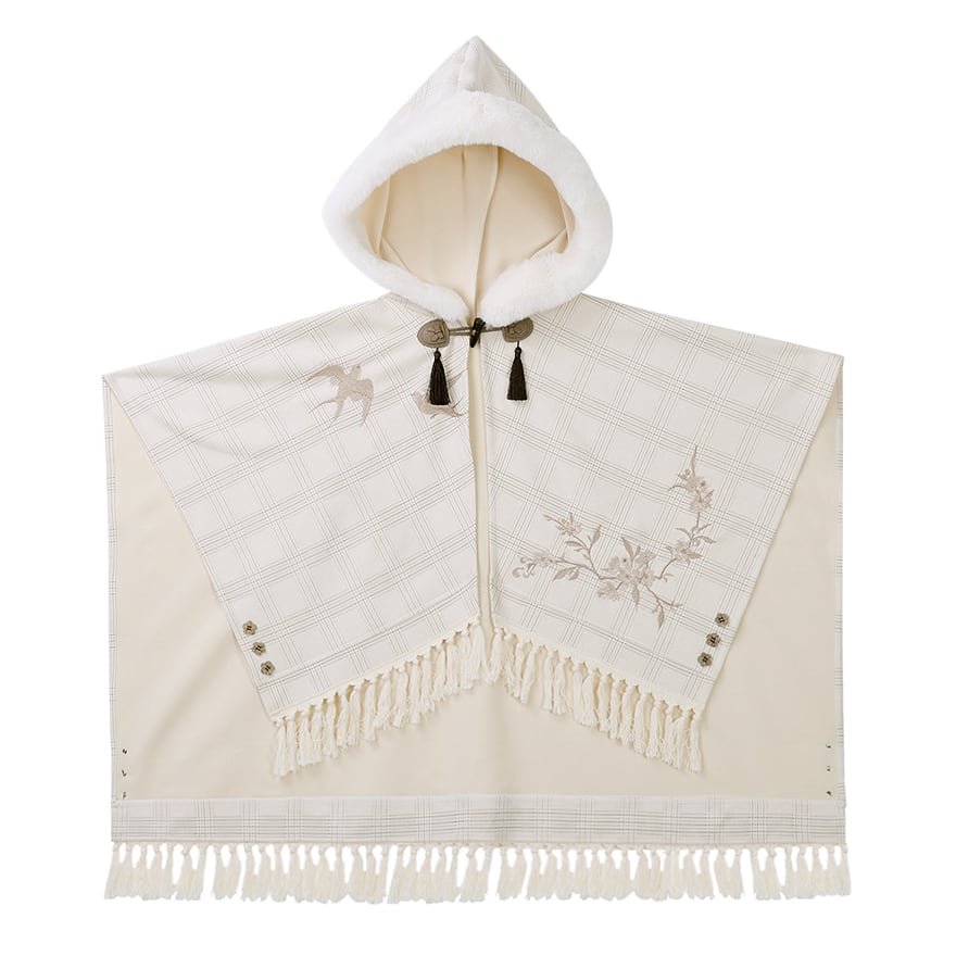 ふんわりとしたファーのフードが顔周りを優しく包み込む、童話の世界から抜け出したようなケープです。