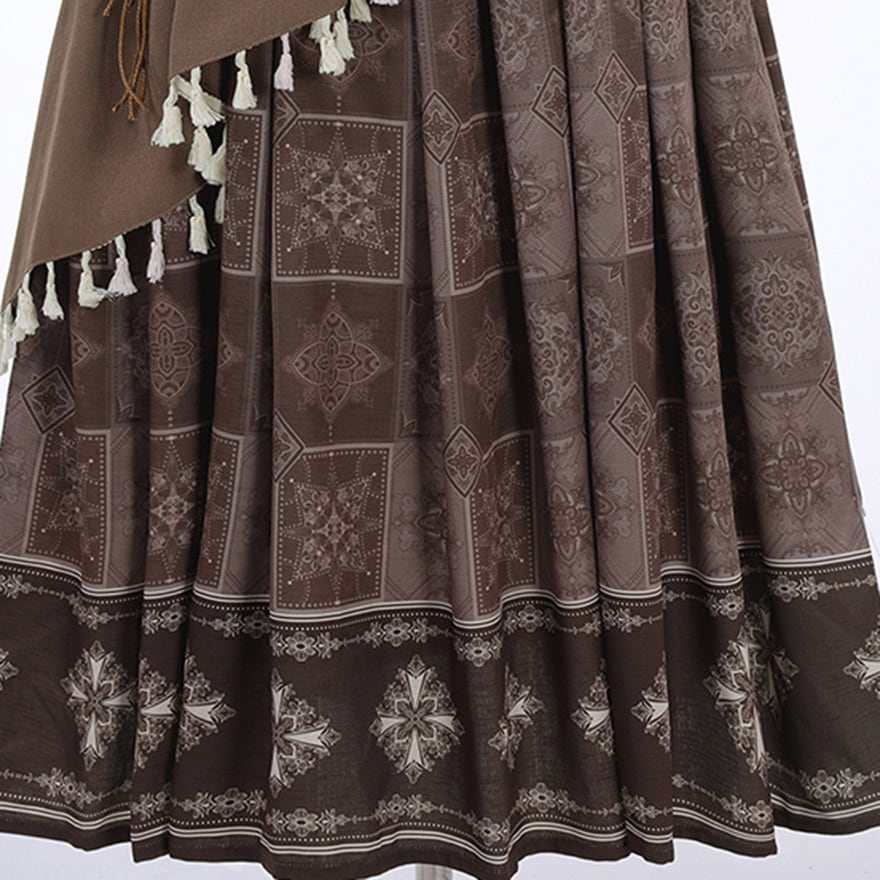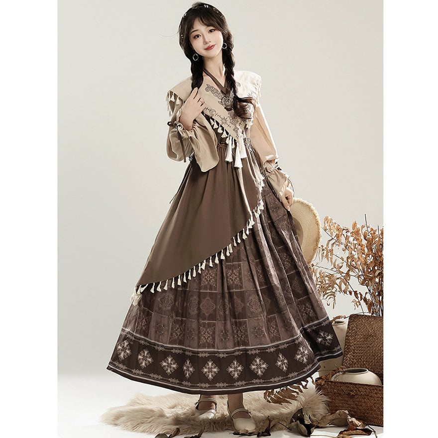 ふんわりとしたボリューム袖のブラウスと、レトロな幾何学模様が美しいロングスカートが、上品で少女らしいシルエットを演出します。