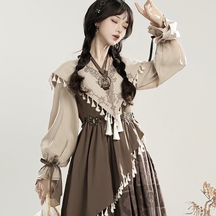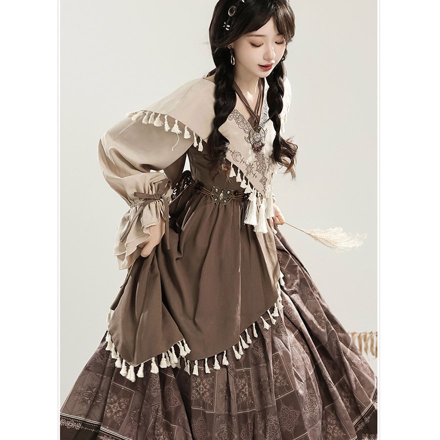 落ち着いたアースカラーを基調とし、どこか懐かしい印象を与えます。特徴的な大きなケープには、繊細な刺繍と揺れるタッセルがあしらわれ、異国情緒をプラス。