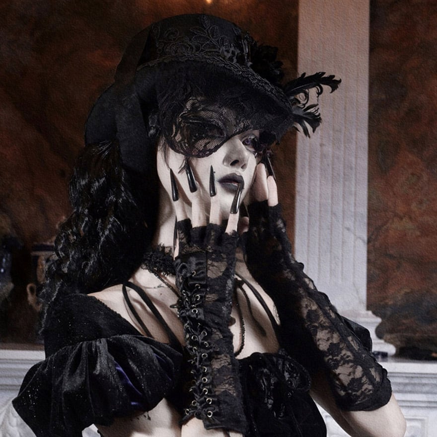 ミステリアスに顔を覆うレースのベールと、サイドから長く垂れるリボンが、ドラマティックで妖艶な印象を与えます。