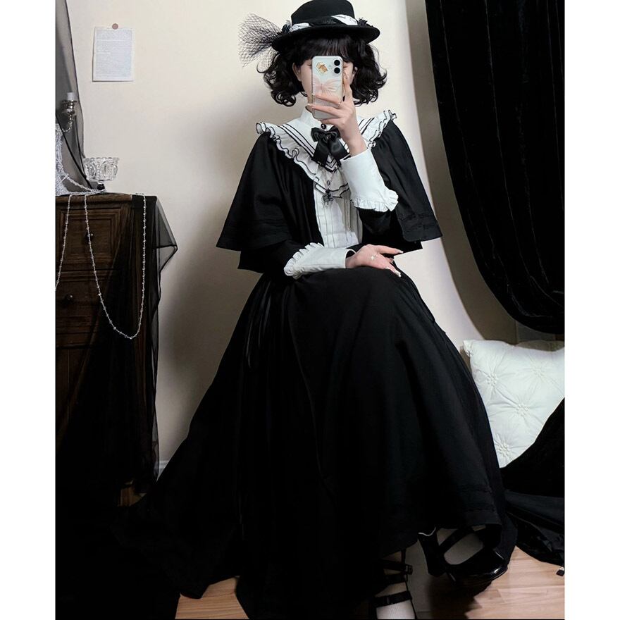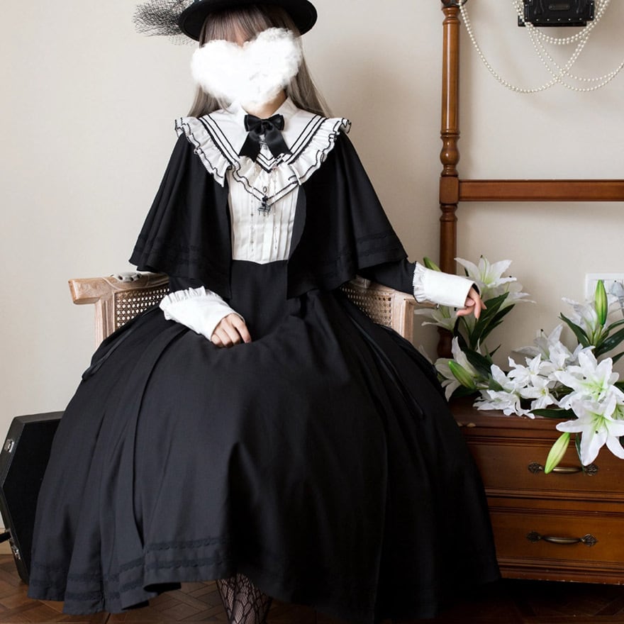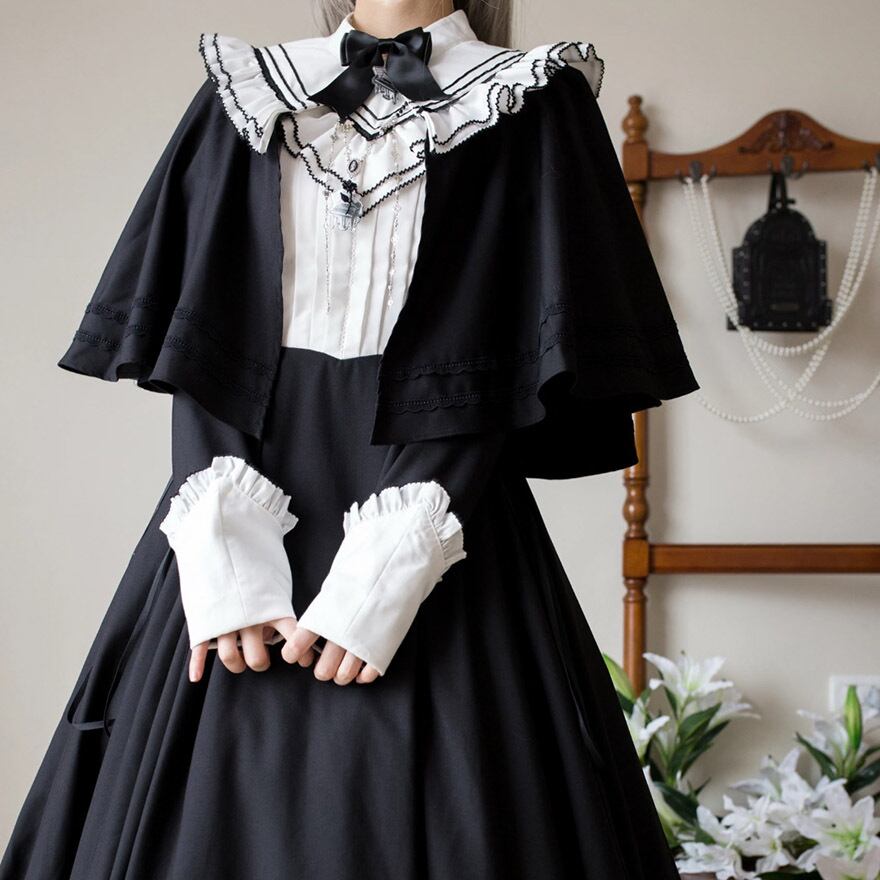 清楚な白のブラウス風ワンピースに、黒のケープを重ねた、修道女を彷彿とさせるゴシックロリータのセットアップです。