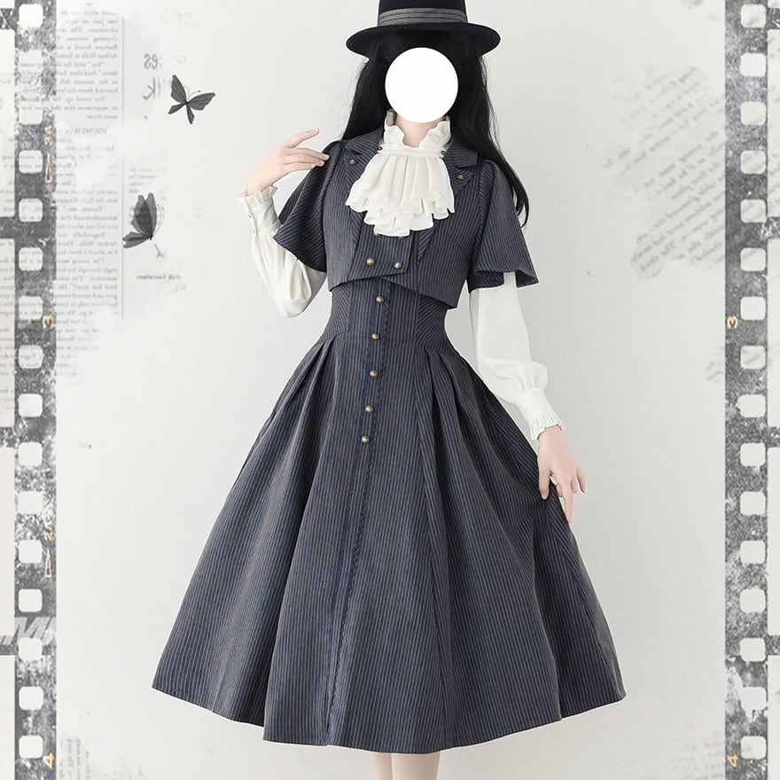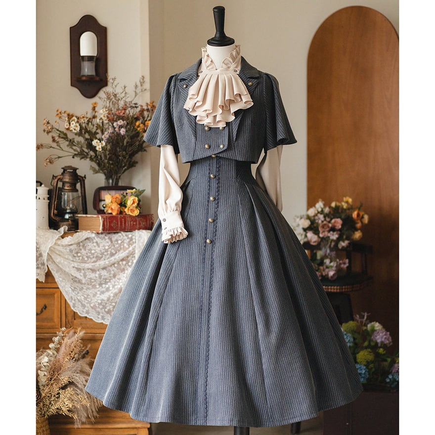 知的な印象を与えるピンストライプ柄と、フロントに並んだアンティーク調のボタンが、ヴィンテージ感を高めます。
