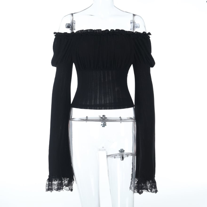 デコルテを美しく見せるオフショルダーデザインのゴシックブラウスです。