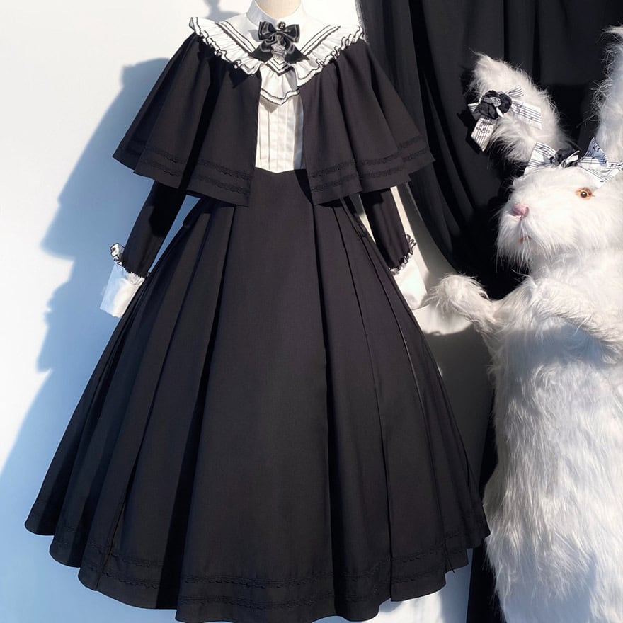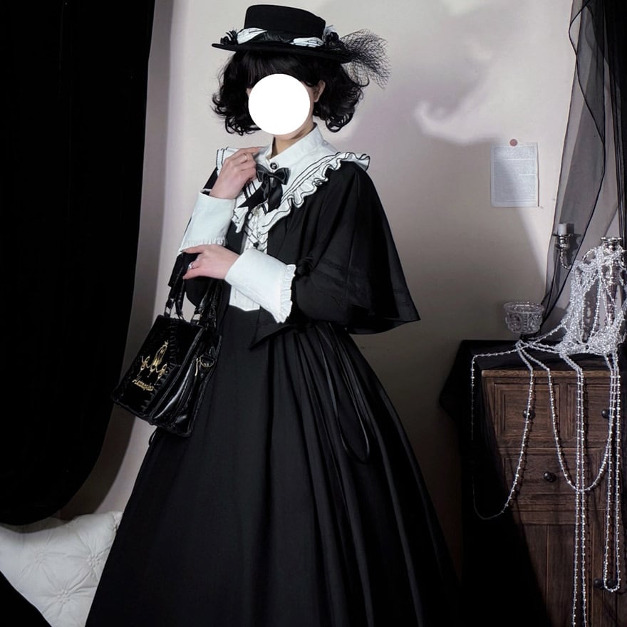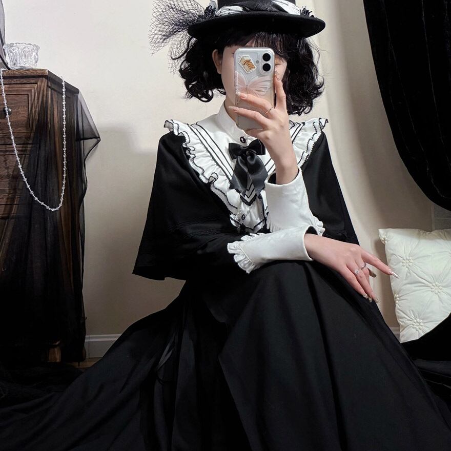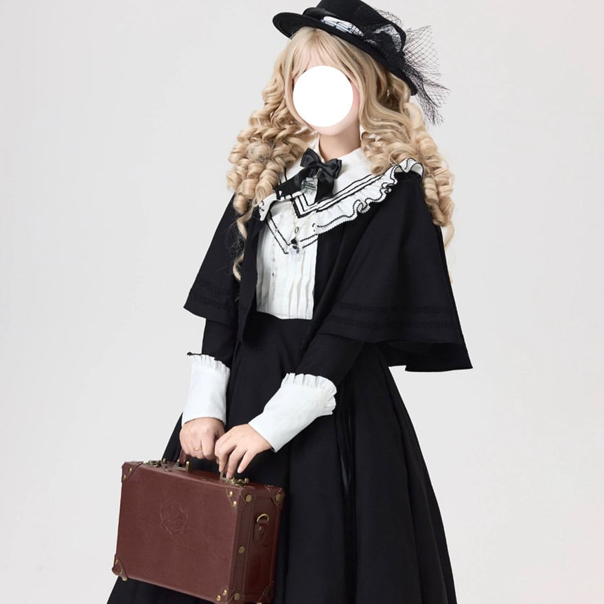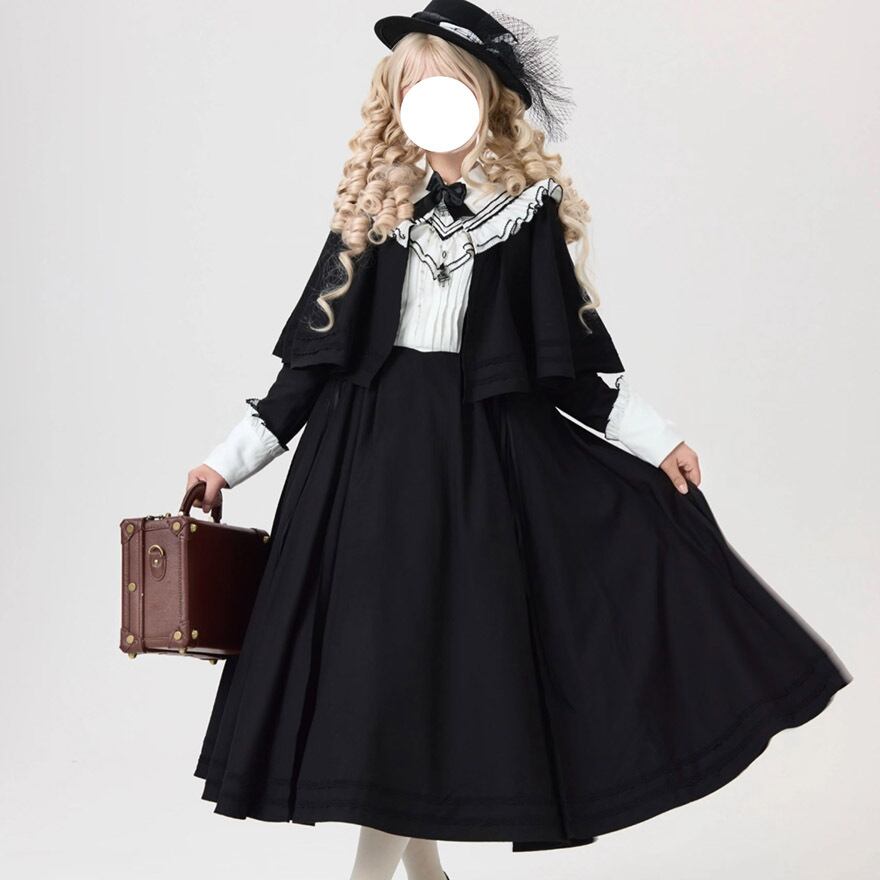 清楚な白のブラウス風ワンピースに、黒のケープを重ねた、修道女を彷彿とさせるゴシックロリータのセットアップです。
