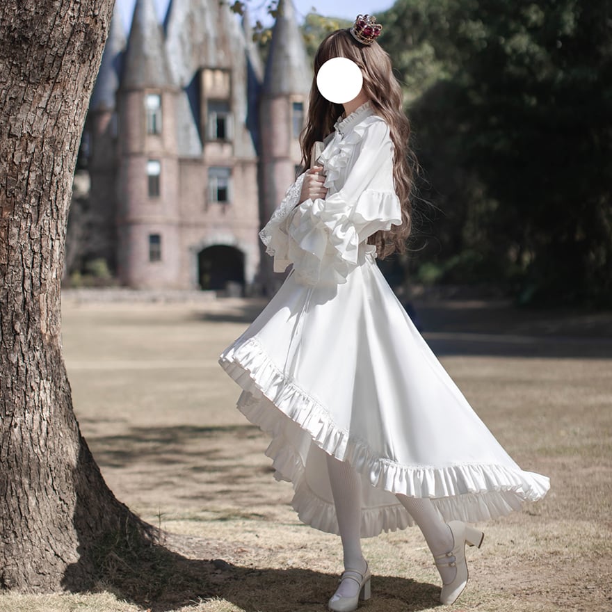 前が短く、後ろが長くなったアシンメトリーなヘム丈のデザインが特徴で、歩くたびに裾のフリルが優雅に揺れ、ドラマティックなシルエットを演出します。