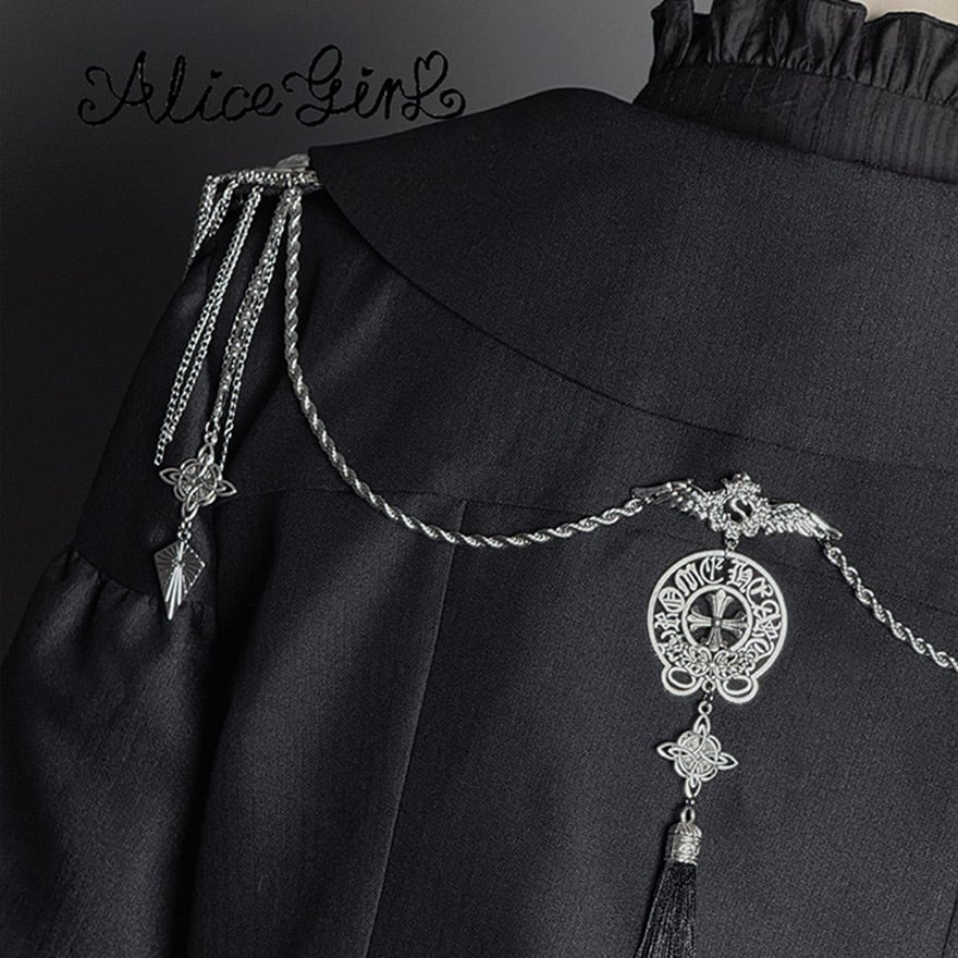 肩から下がるチェーンの肩章飾りが、動くたびに揺れて目を惹きます。襟元や胸元には繊細な銀刺繍が施され、ダークな中に華やかさをプラス。