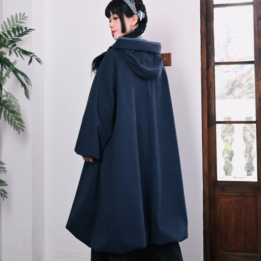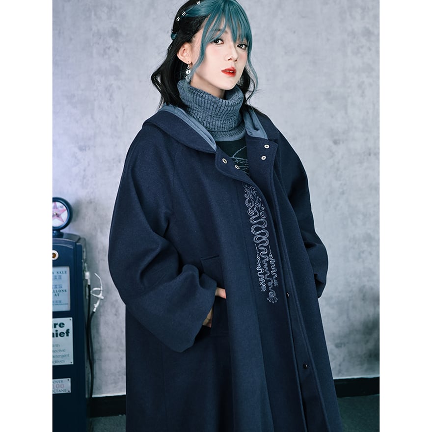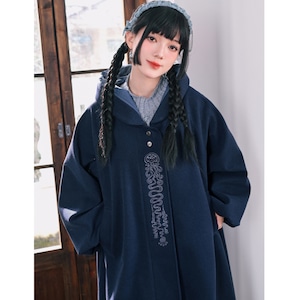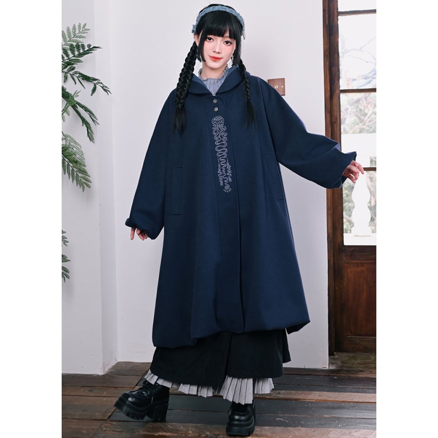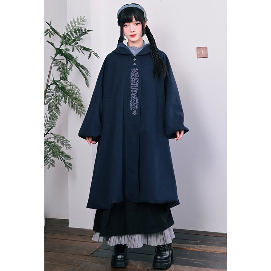 落ち着いたネイビーブルーの生地に、縦に施された繊細なチャイナ刺繍が映えるフード付きロングコートです。