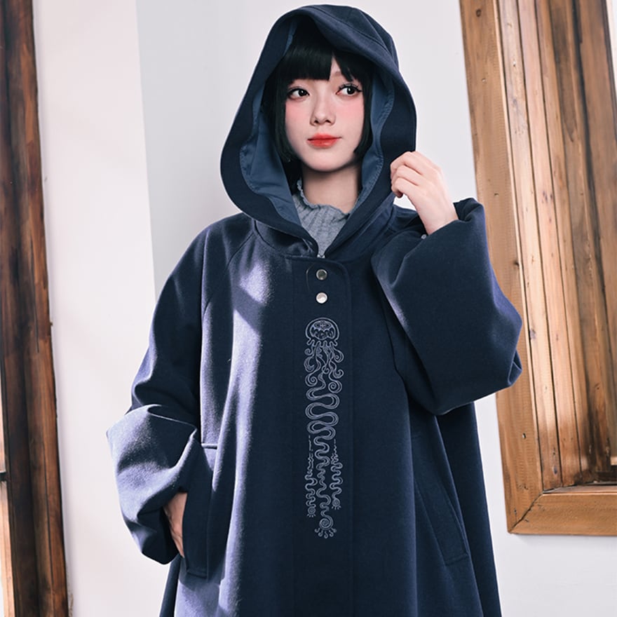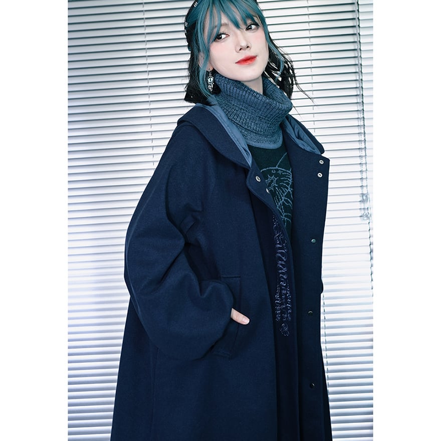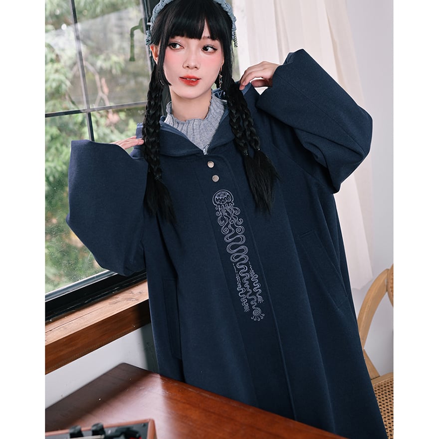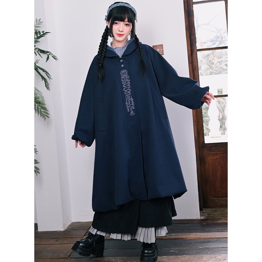 落ち着いたネイビーブルーの生地に、縦に施された繊細なチャイナ刺繍が映えるフード付きロングコートです。