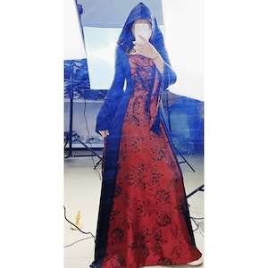 艶やかな深紅のダマスク柄生地と、シックなブラックを組み合わせた、フード付きのロングワンピースです。