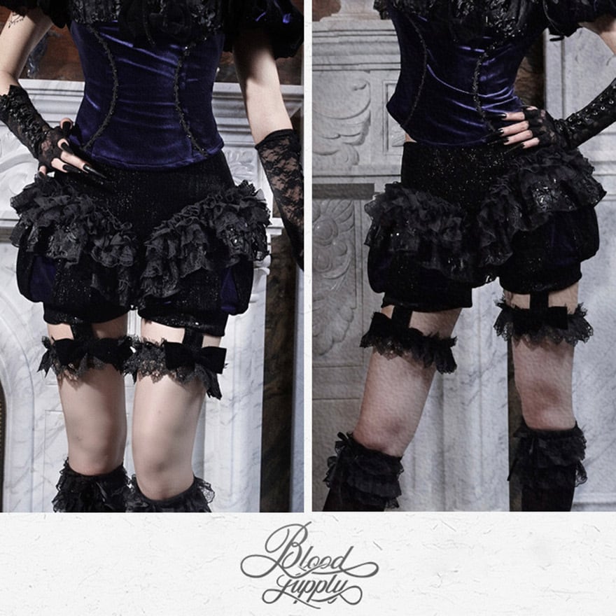煌めくラメ糸が織り込まれた黒い生地に、幾重にも重ねられた黒いフリルと繊細なレースが豪華にあしらわれたかぼちゃパンツです。