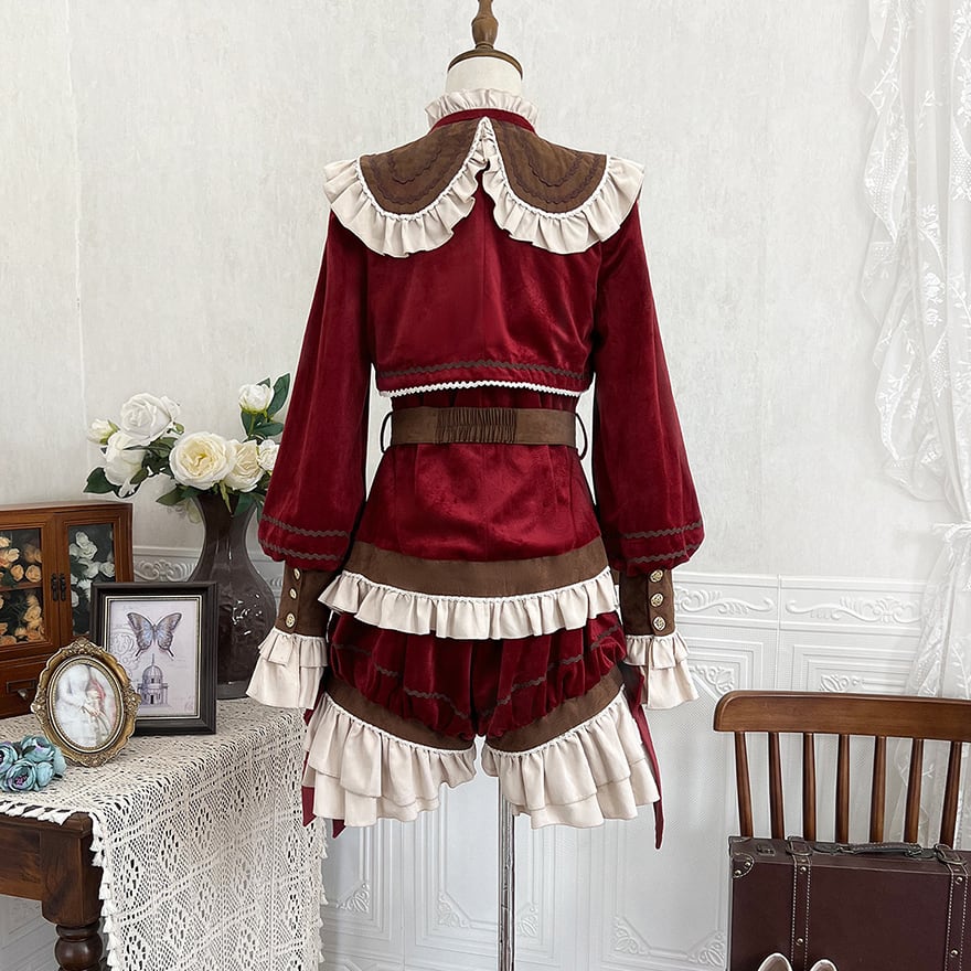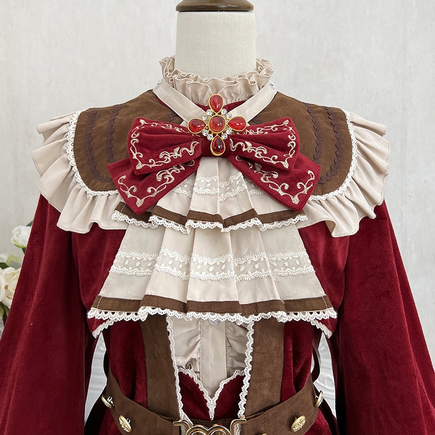 光沢のあるベロア調の生地を使用し、胸元や袖口、パンツの裾にはクリーム色のフリルがふんだんにあしらわれています。首元を飾る大きなリボンと宝石のようなブローチが、華やかさと高級感を演出。