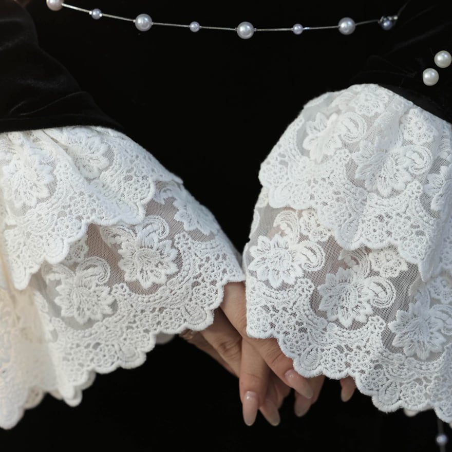 ネックラインとベルスリーブの袖口には、繊細で美しいオフホワイトのレースが贅沢にあしらわれています。スタンドカラーと、肩を優雅に覆う大きなレースの付け襟が、ヴィクトリアンな雰囲気を醸し出します。