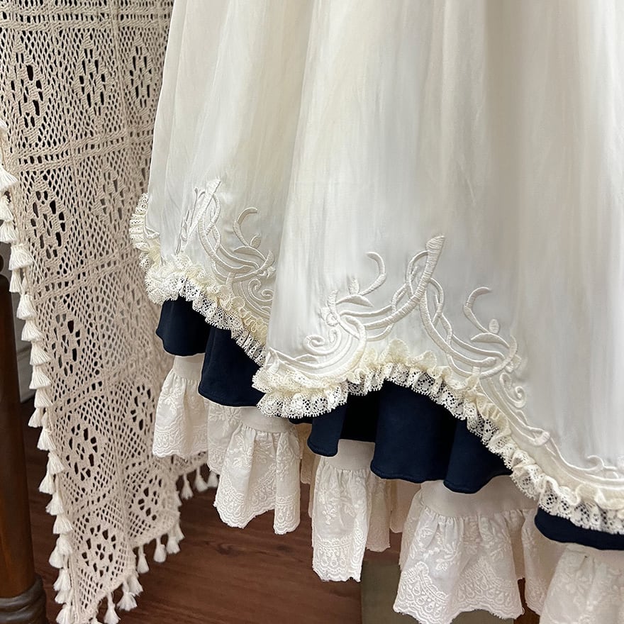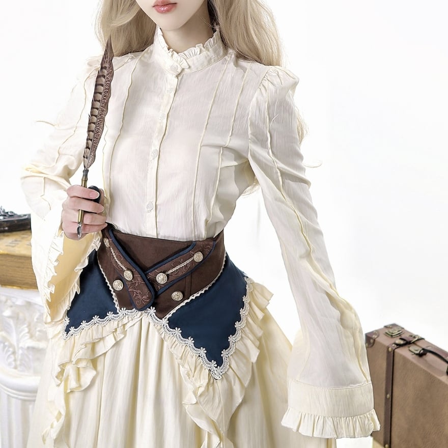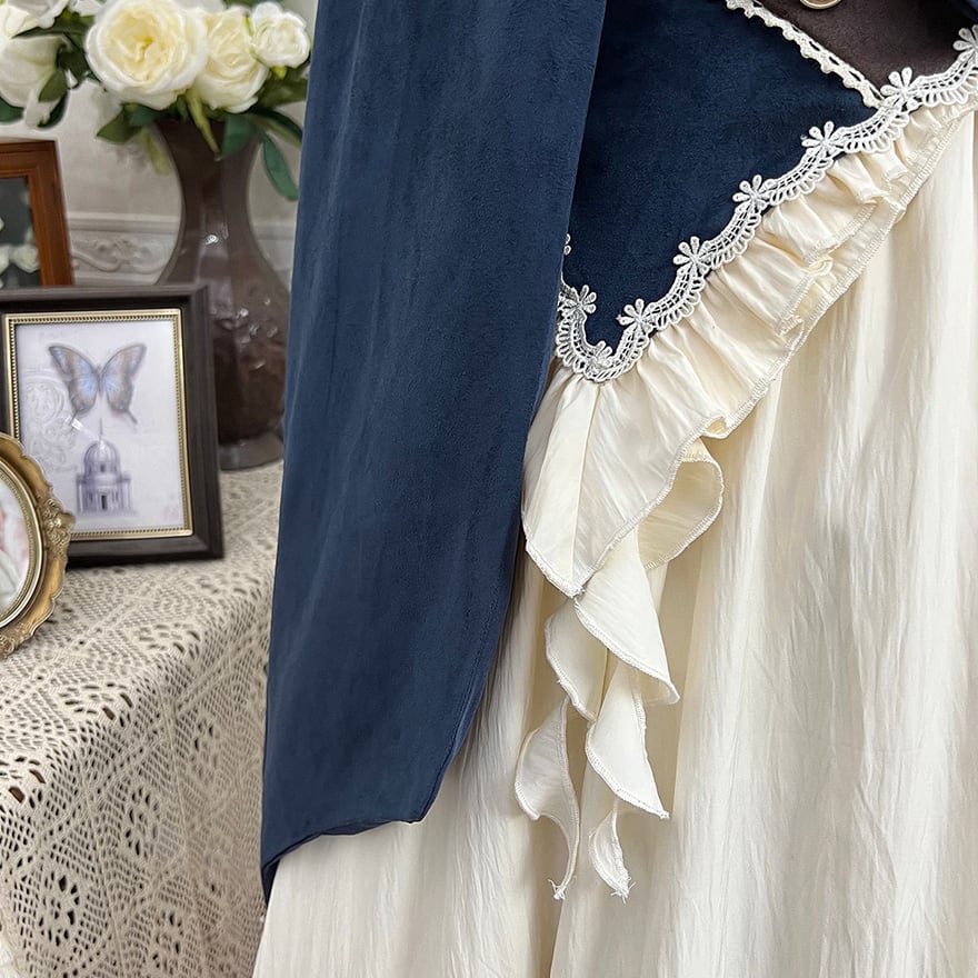 スエード調の気品あるケープは、胸元のアンティークゴールドの飾りがアクセント。スタンドカラーのブラウスと、裾に美しい刺繍とフリルが施されたボリューム感のあるスカートが、クラシカルな雰囲気を演出します。
