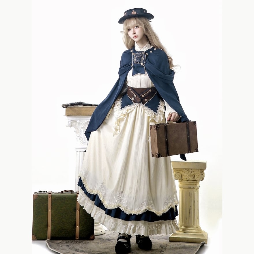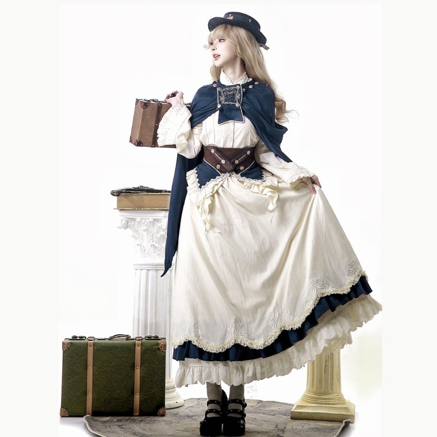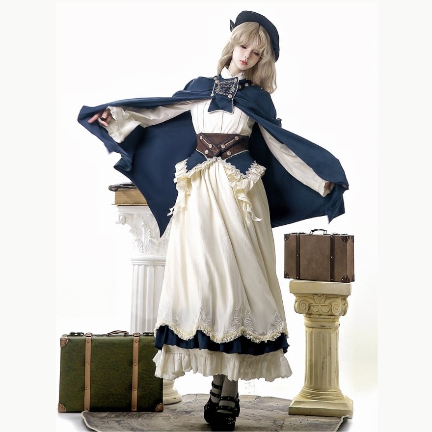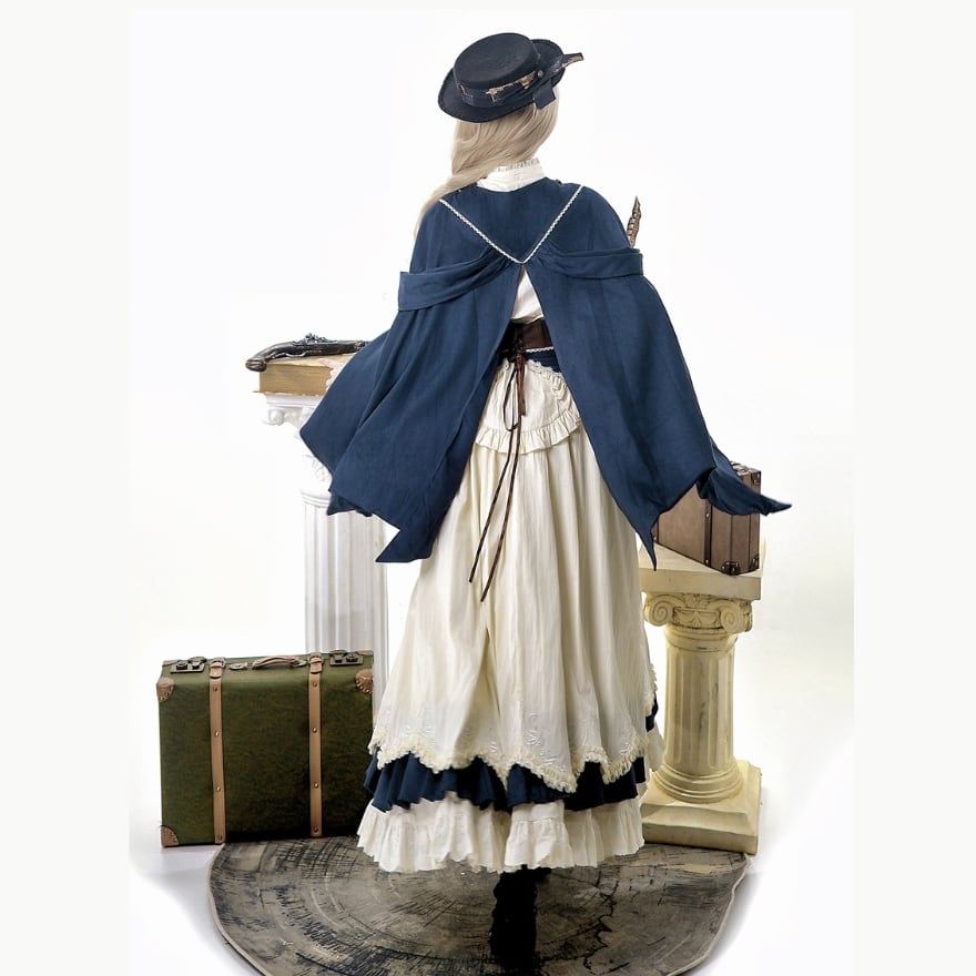 ネイビーのケープ、アイボリーのブラウスとスカート、ブラウンのウエストベルトがセットになった、完成度の高いコーディネートが楽しめる一式です。