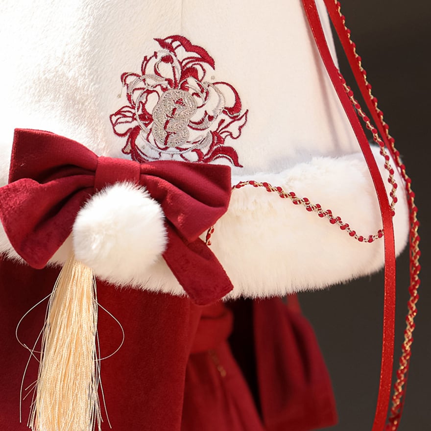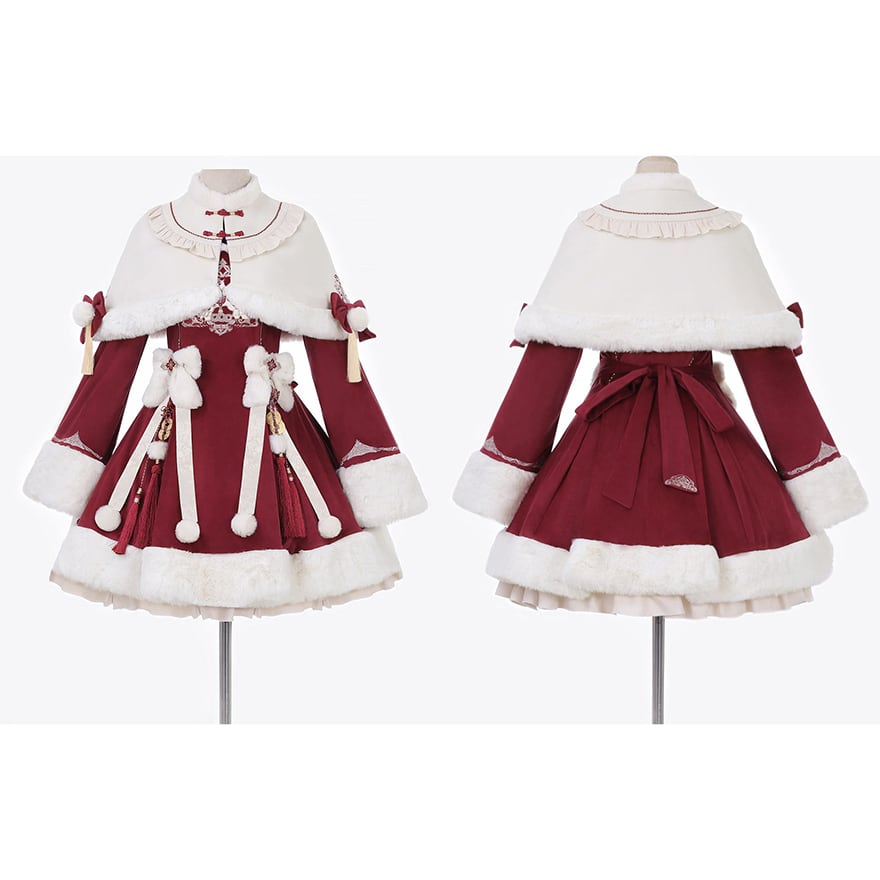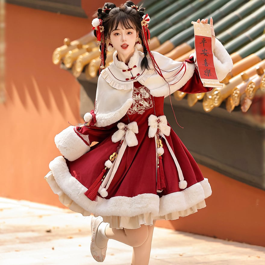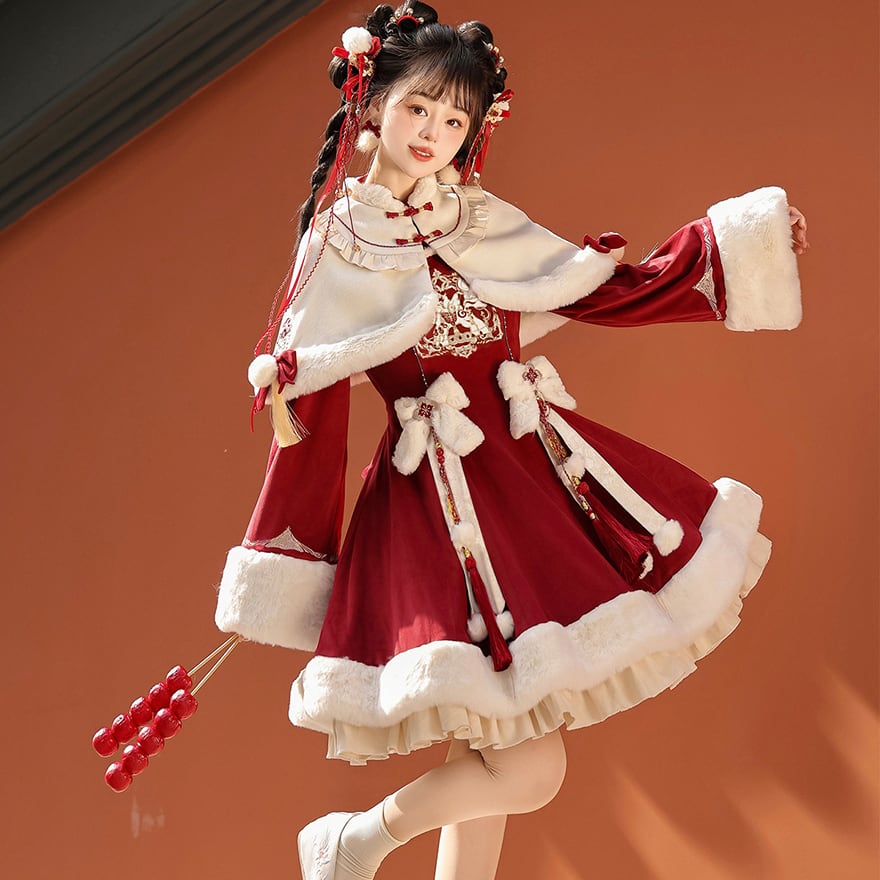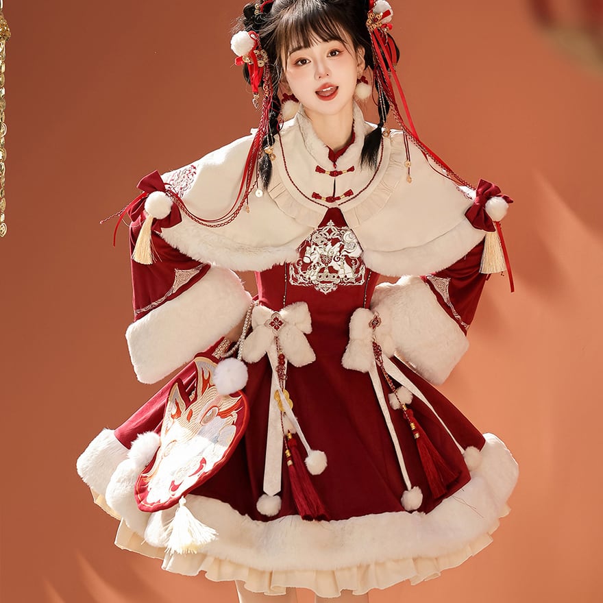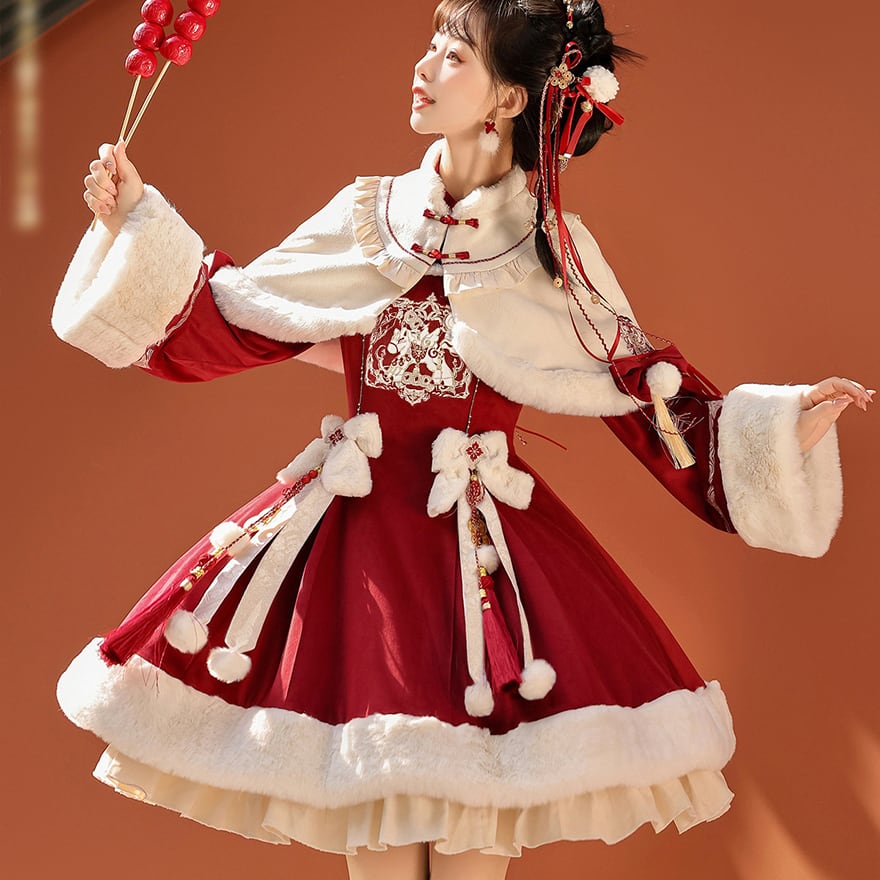 深みのある赤のベルベット調生地に、もこもこの白いファーが映える、愛らしい中華風ロリータのセットアップです。