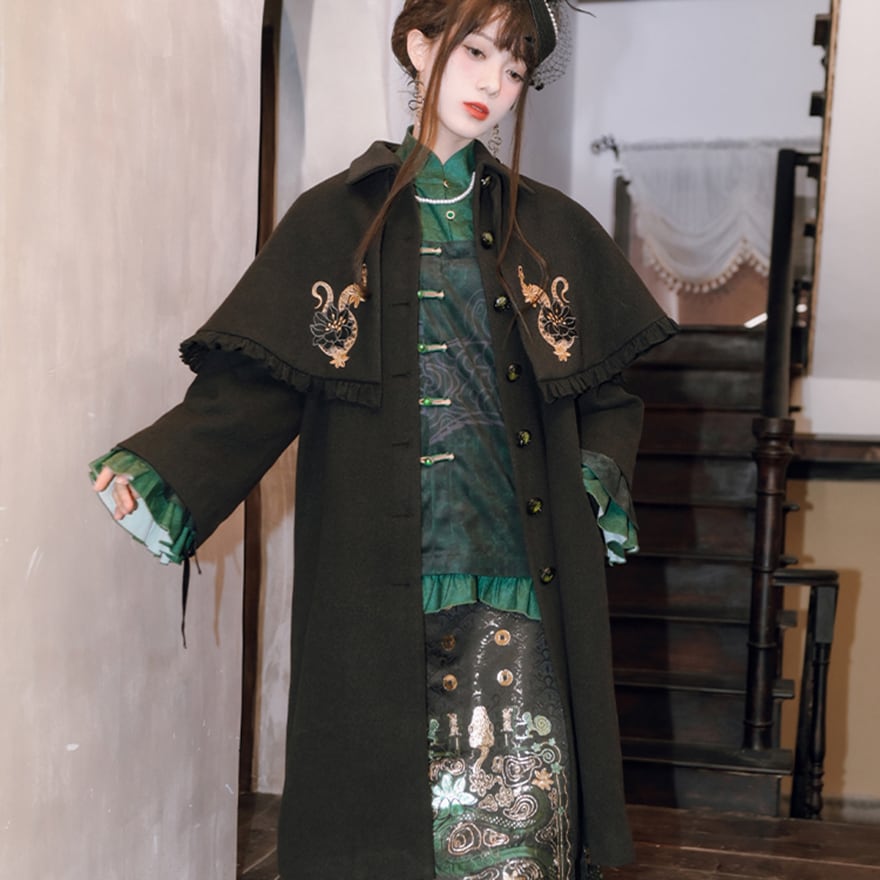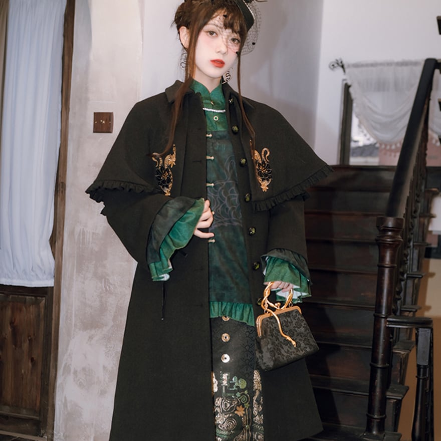 ケープには、ミステリアスな雰囲気を高める金色の龍の刺繍が施されています。