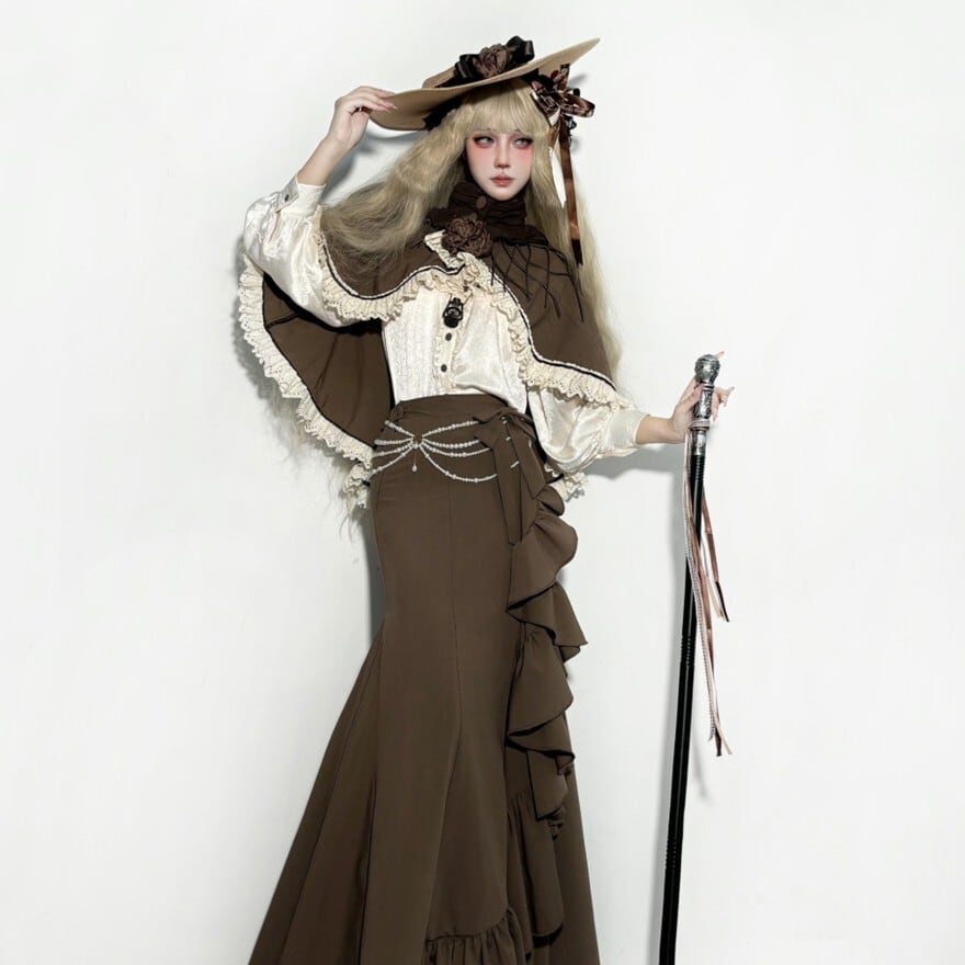 ボリュームのあるケープのシルエットと、落ち着いたブラウンの色使いが、クラシカルでミステリアスな雰囲気を演出します。