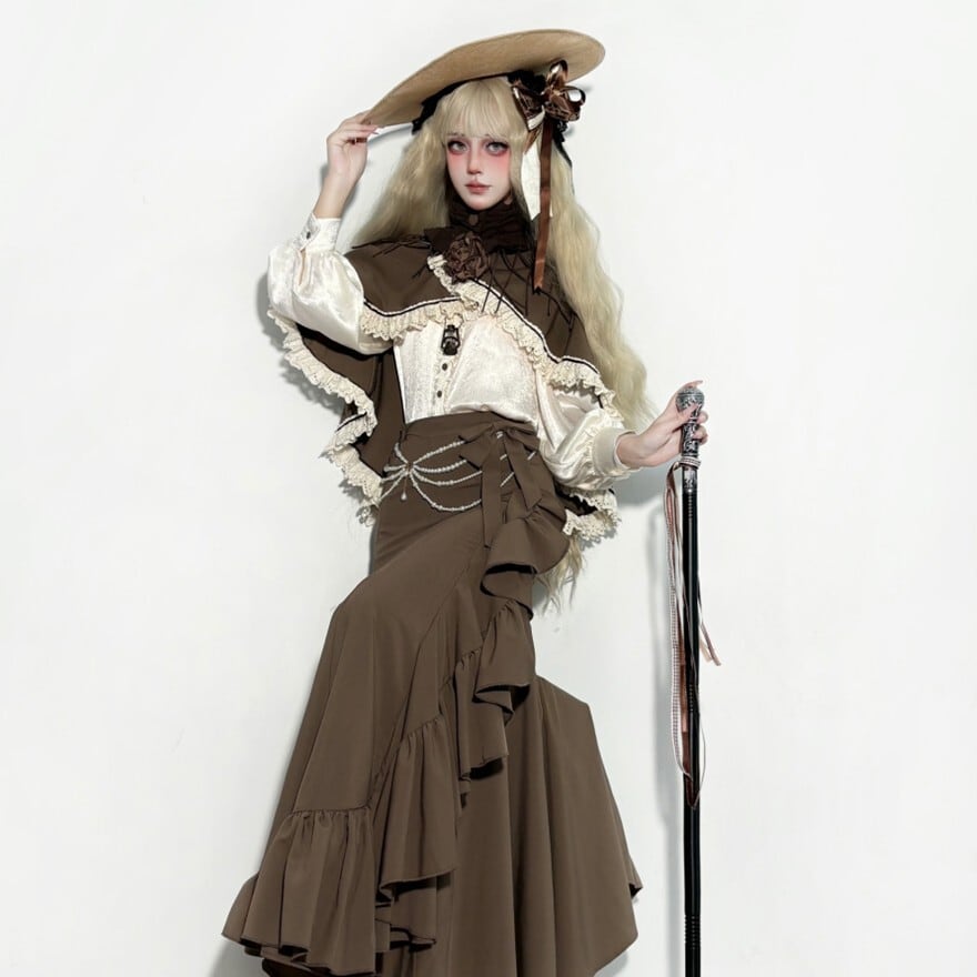 深みのあるブラウンの生地に、オフホワイトのケミカルレースとフリルが組み合わされた、クラシカルな雰囲気のマント風ケープです。