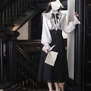 白のブラウスと、黒のハイウエストスカートを組み合わせたような、セットアップ風のデザインが特徴のワンピースです。