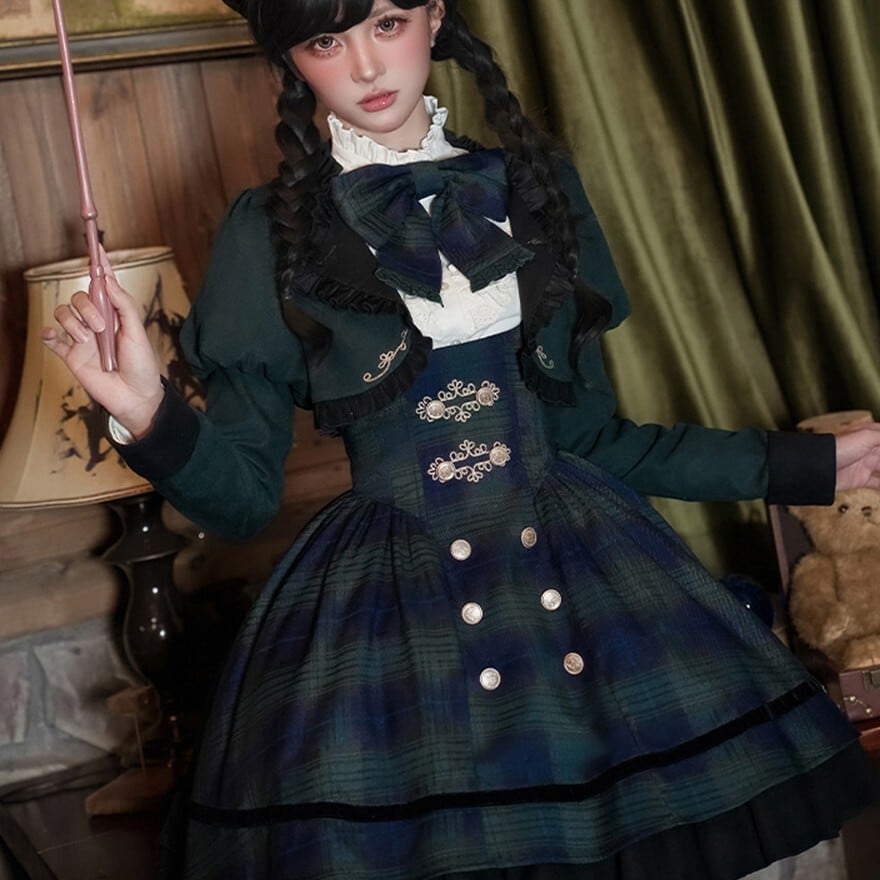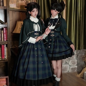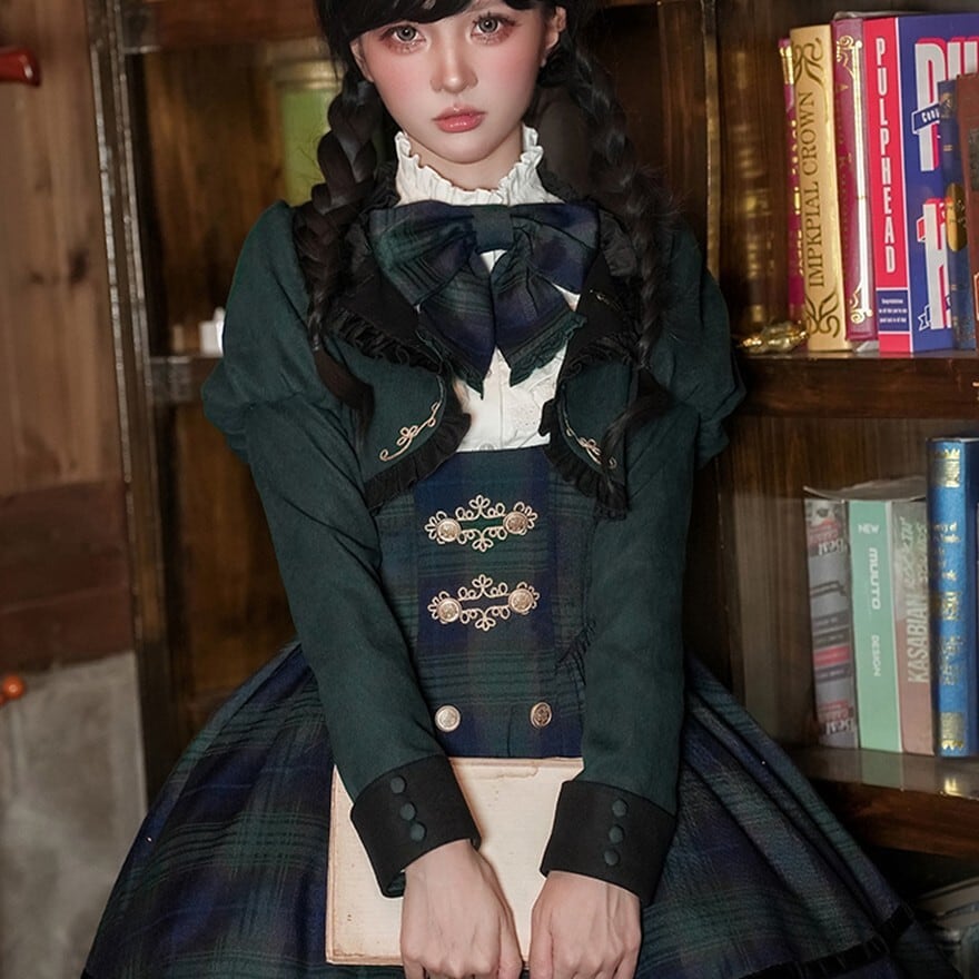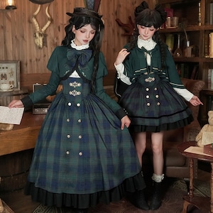 深みのあるグリーンとネイビーのチェック柄がレトロな雰囲気のショート丈ジャンパースカートと、パフスリーブとフリルが愛らしいオフホワイトの長袖ブラウスのセットアップです。