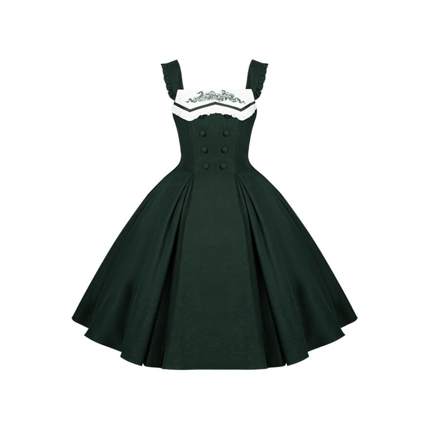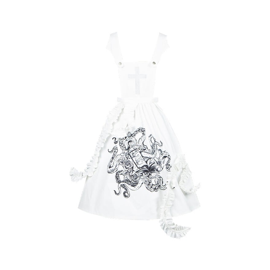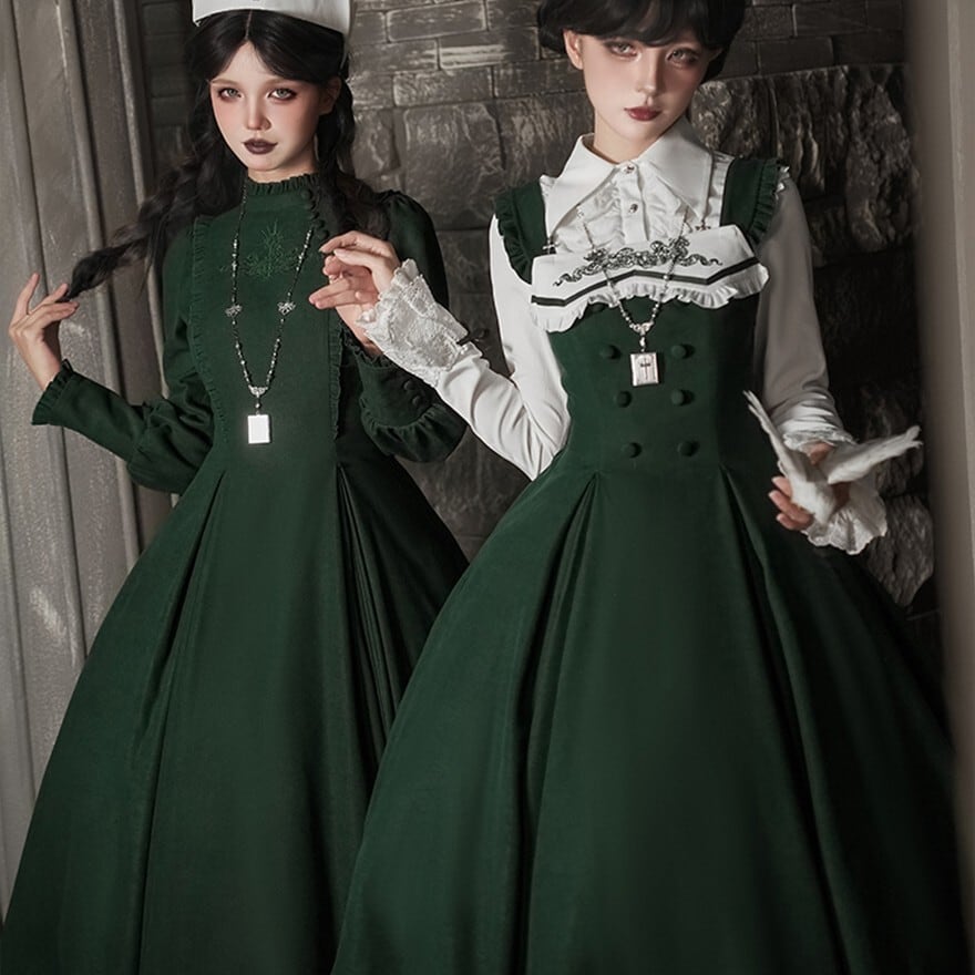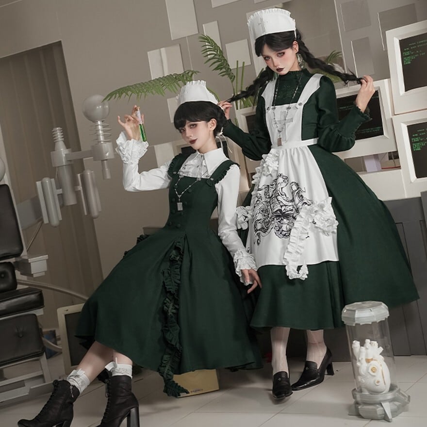 深いダークグリーンのジャンパースカートに、フリルとタコの触手のようなモチーフのプリントが施された白のエプロンを重ね、さらに長袖の白いブラウスを組み合わせた、ゴシック&クラシカルなロリータセットアップです。