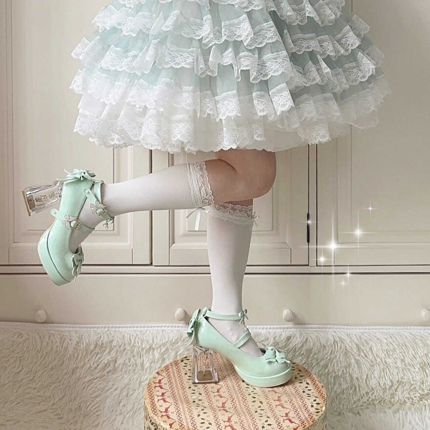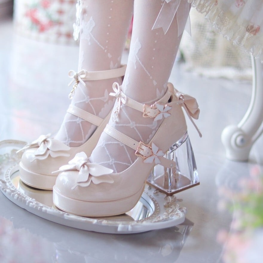 クリアヒールとリボンが、足元を軽やかに、そして特別なものにしてくれます。光を反射するたびにキラキラと輝き、お茶会やイベントで注目を集めること間違いなしです。