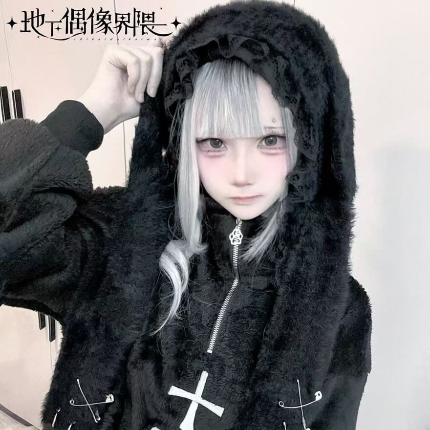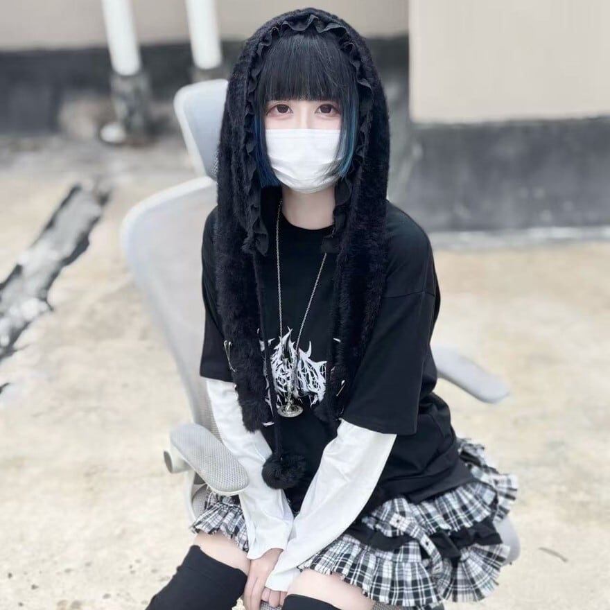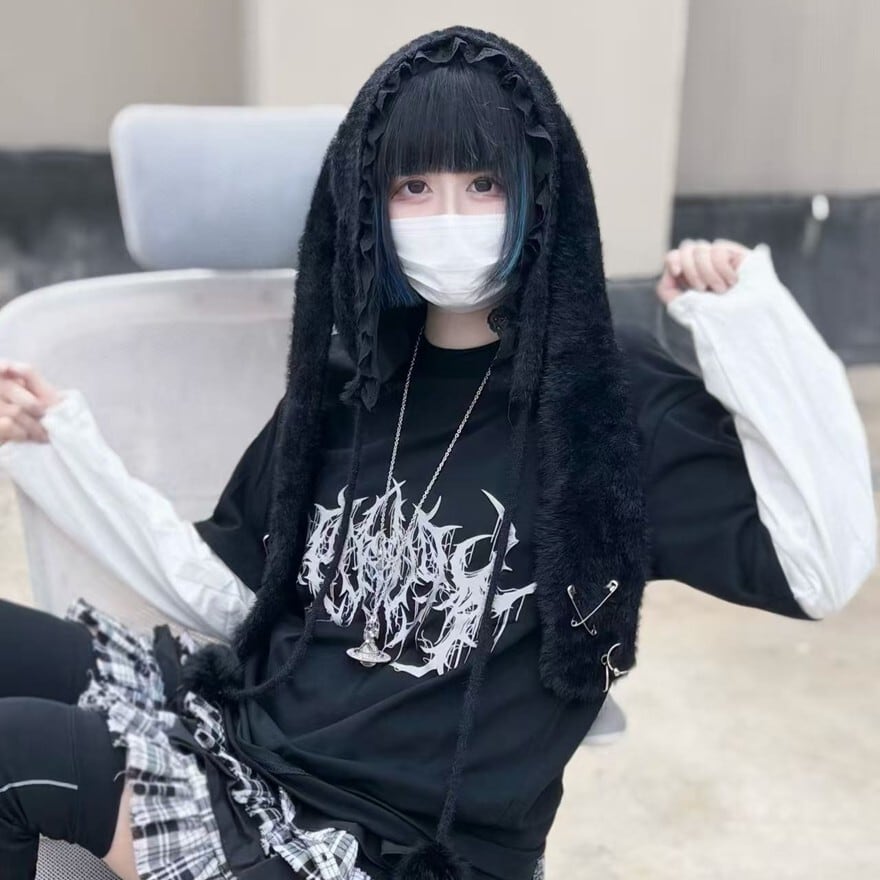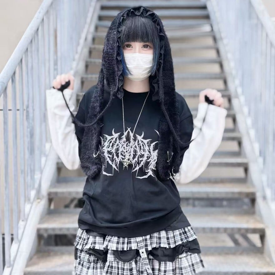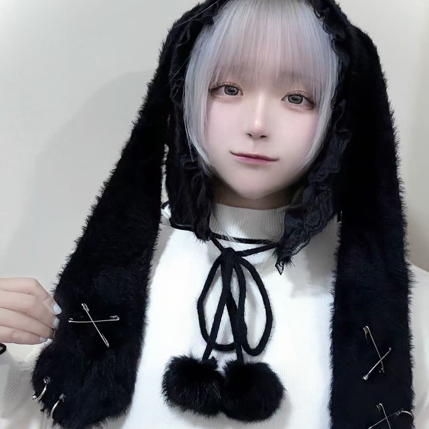 関連キーワード: #うさ耳帽 #ファー #地雷系 #サブカル系 #ストリートファッション #モノトーン #安全ピン #ポンポン #甘辛ミックス