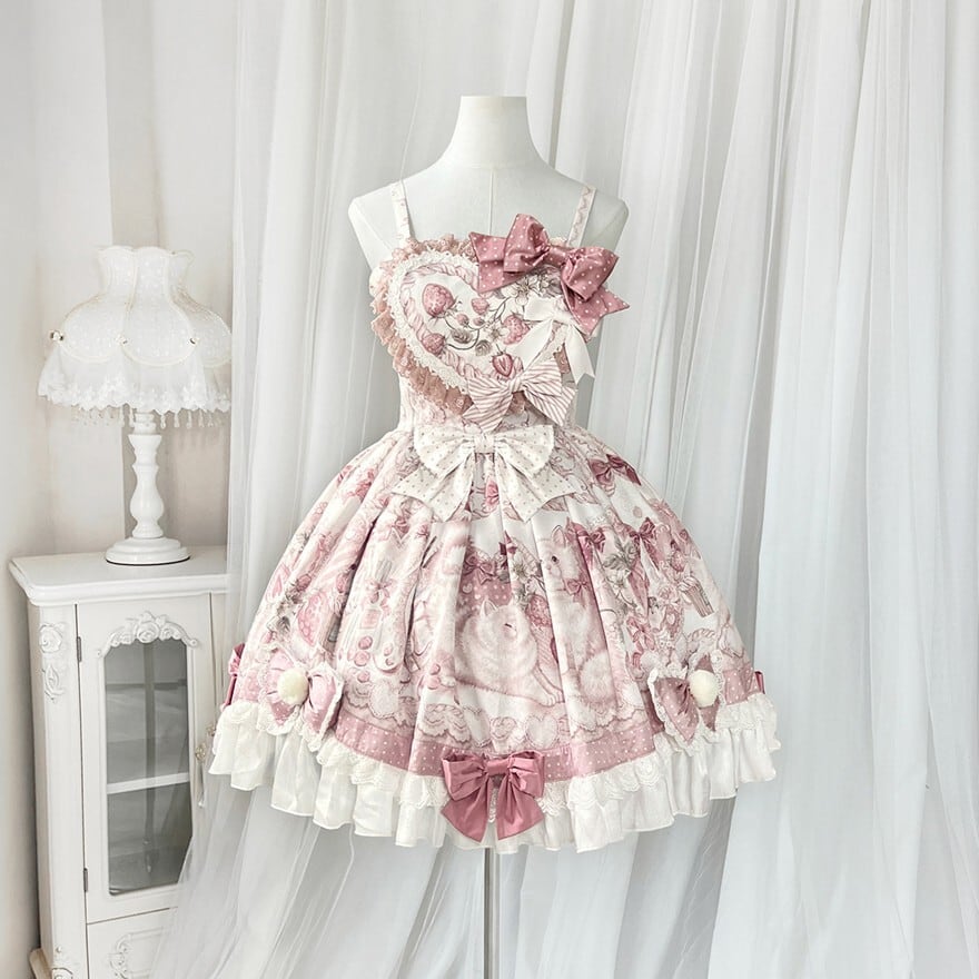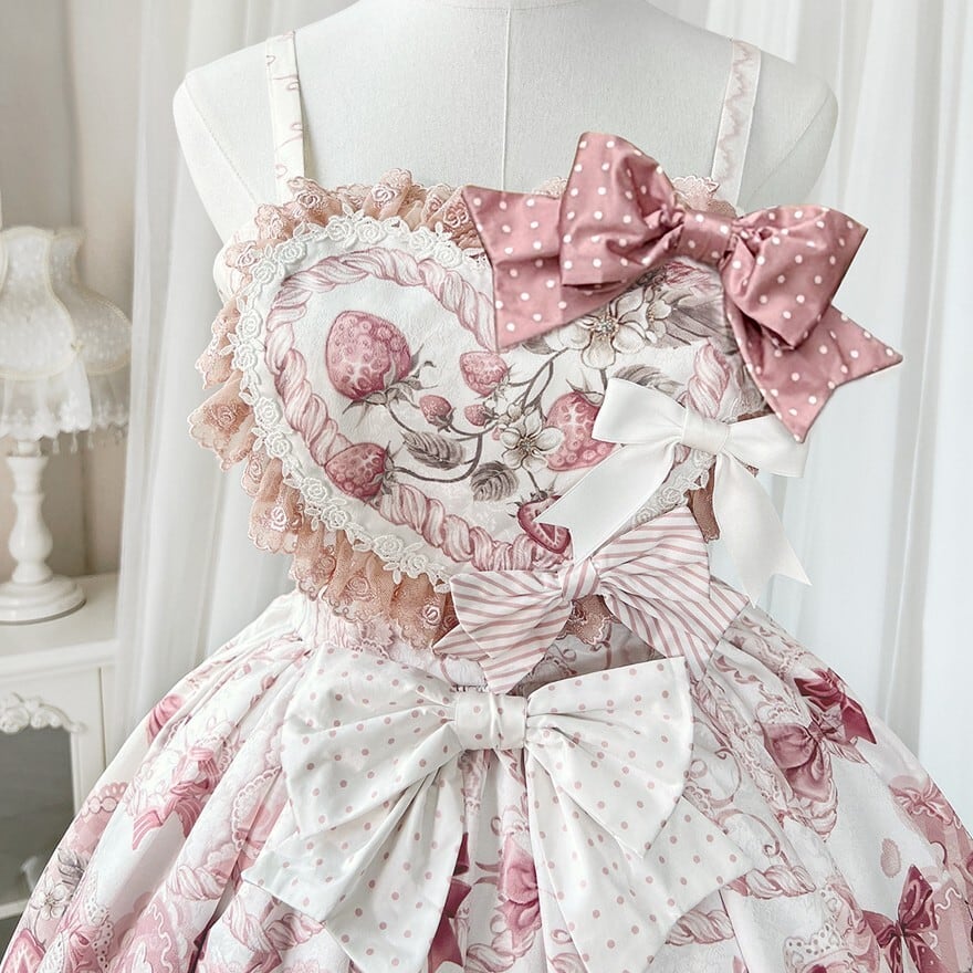 ジャンパースカートは繊細なレースとリボン、フリルが贅沢にあしらわれ、スカートには立体的なリボンとポンポン装飾が施されています。