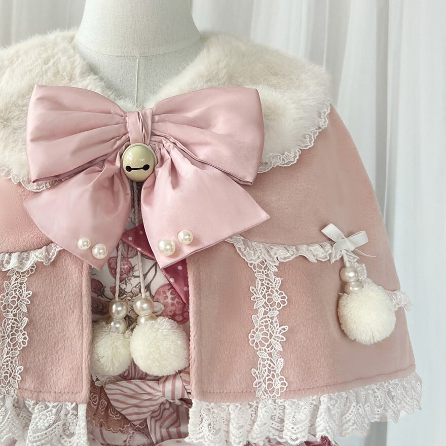 ケープには大きなリボンとレーストリムが付いており、肩を包み込むようなシルエットが可憐な印象を与えます。
