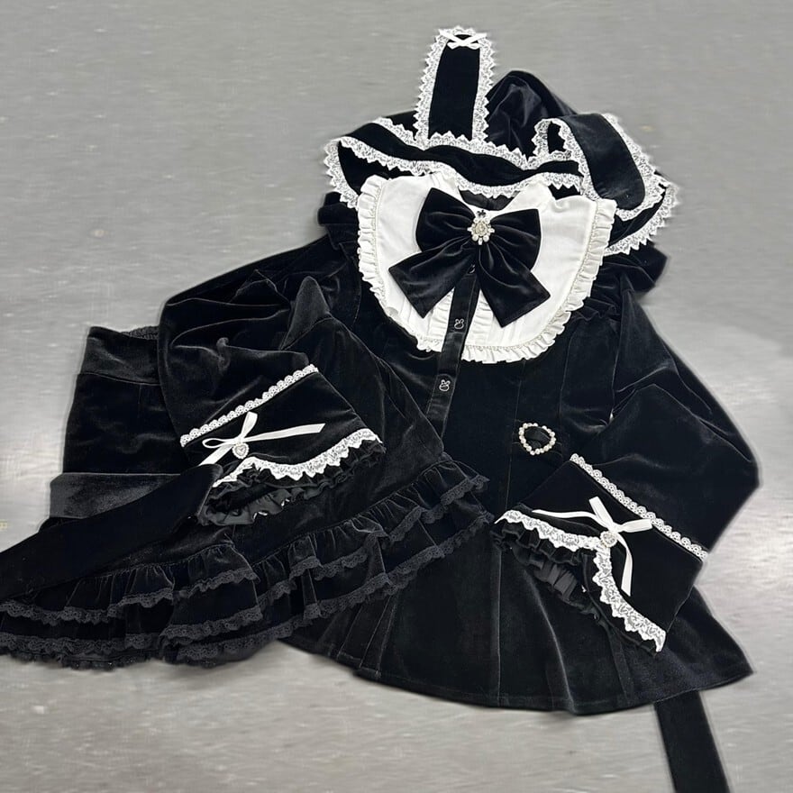 シックな黒を基調としながらも、フリルやレース、そしてハートのディテールが華やかさと可愛らしさを演出するセットアップです。