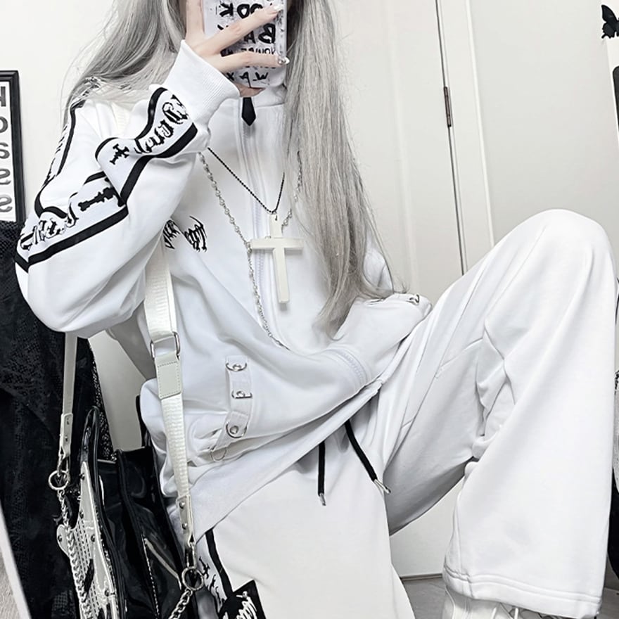 天使界隈・地雷系 パンツ 十字架グラフィック ラインジャージ (ホワイト/ブラック)