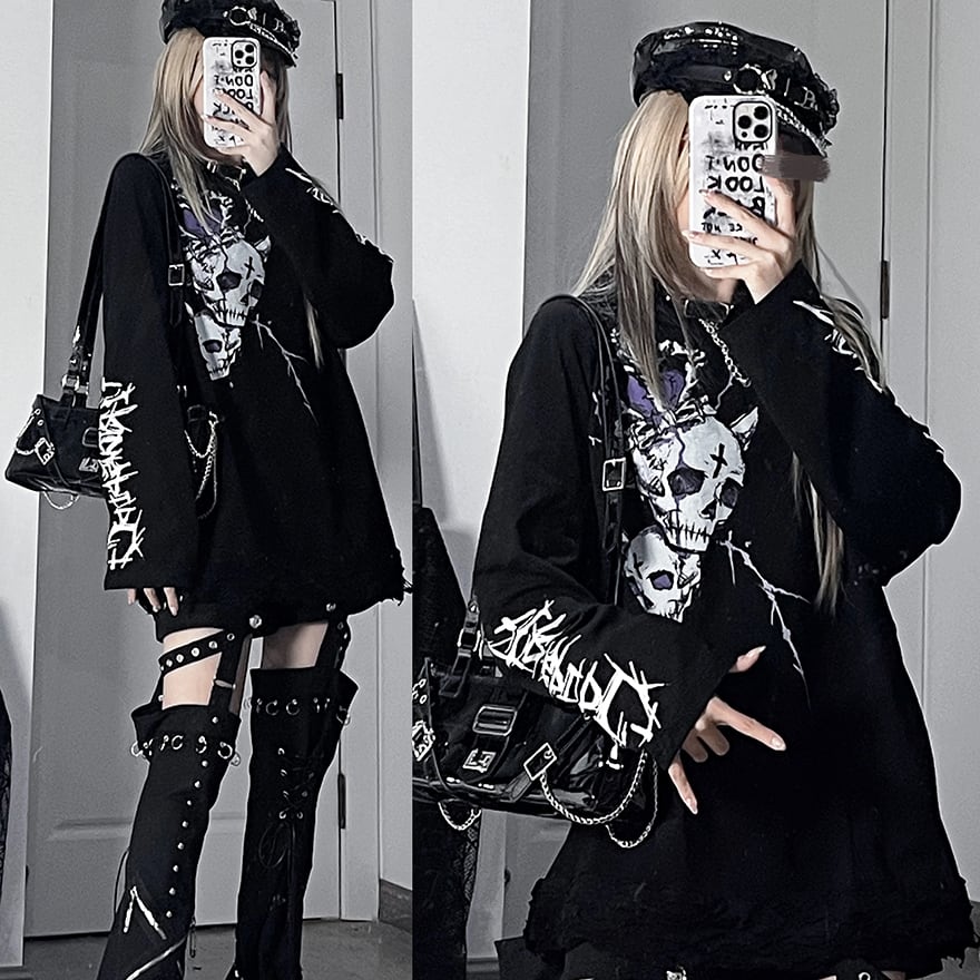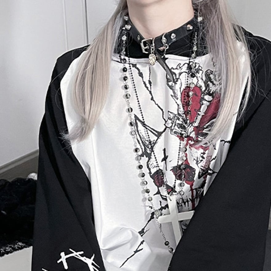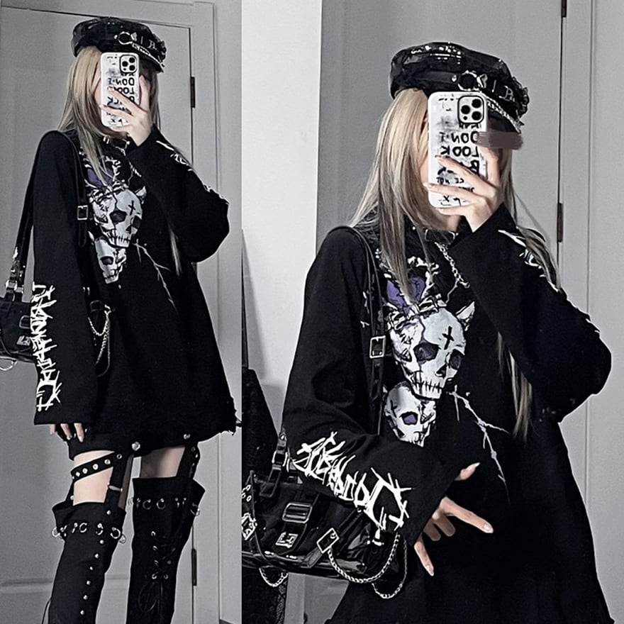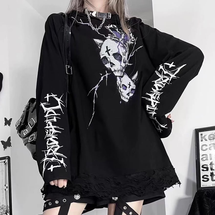 地雷系 天使界隈 スカルプリント ダメージ ロンT ラグランスリーブ パンク オーバーサイズ ユニセックス