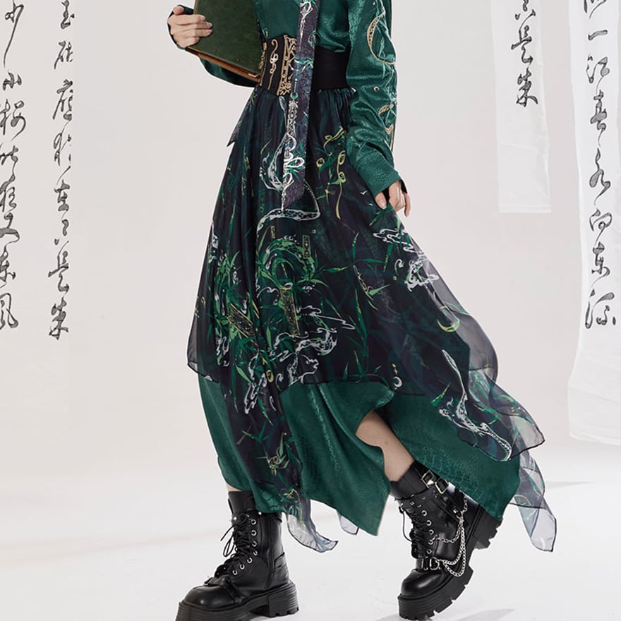 中華 ゴシック アシンメトリー シフォン スカート|チャイナ 風 柄 プリント サブカル ボトム 卿棠