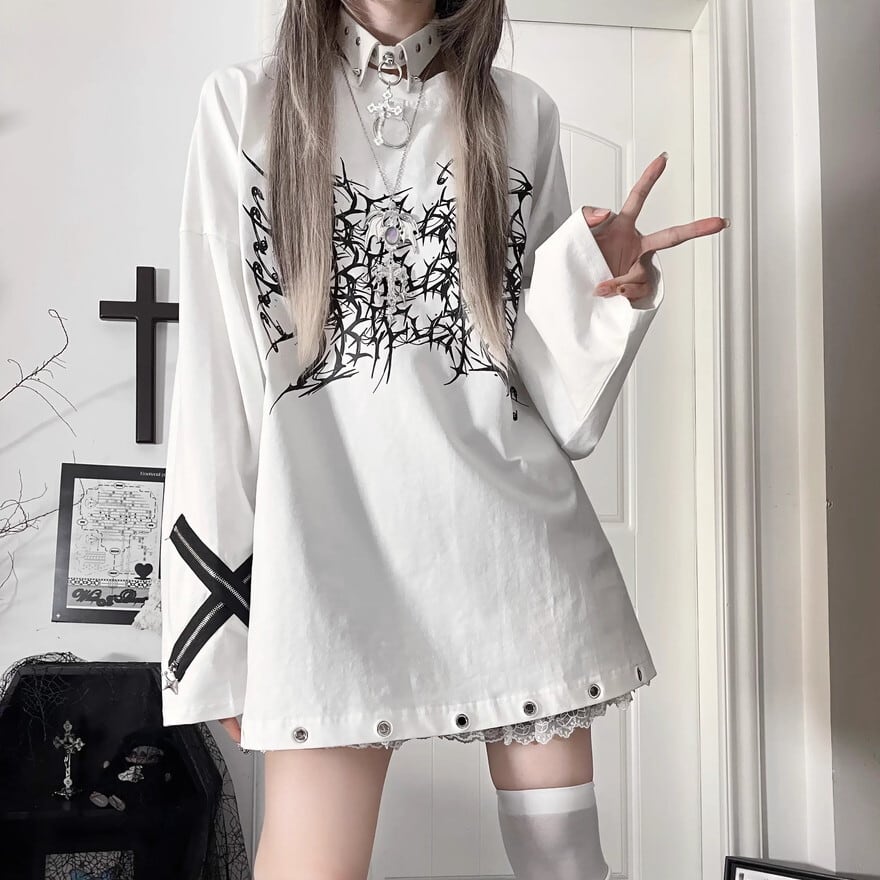 サブカル 暗黒 グラフィック ビッグシルエット ロングスリーブ Tシャツ|地雷系 ゴシック 病みかわ 長袖 トップス