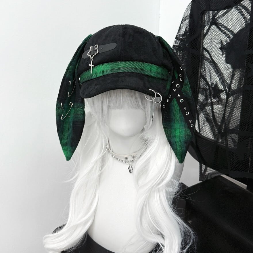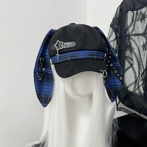 垂れ耳 パンク キャップ チェック切替 リング付き 地雷系 サブカル 帽子