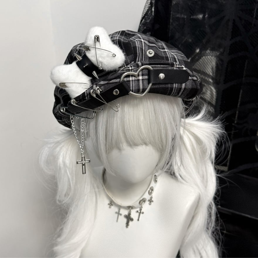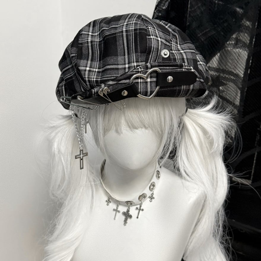 骨モチーフ チェック ベレー帽 サブカル パンク ゴシック アクセ付き 帽子